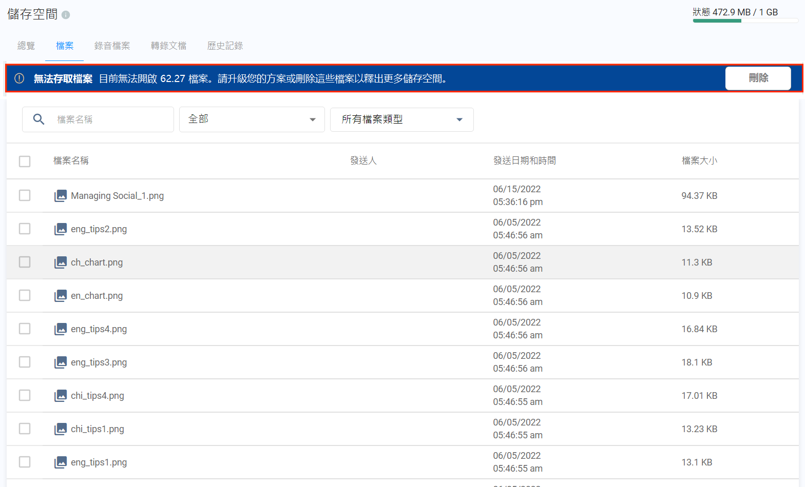 受你的服務方案所限,超過最長報告日數的文件,顯示其大小。你需要升級服務方案,或刪除它們,以釋放儲存空間。