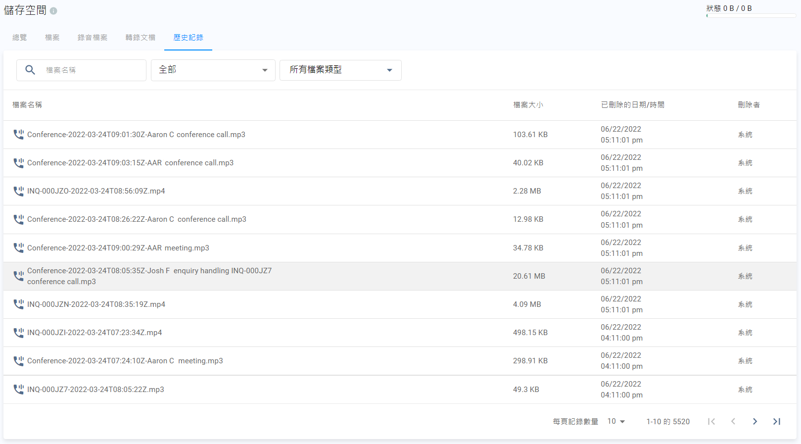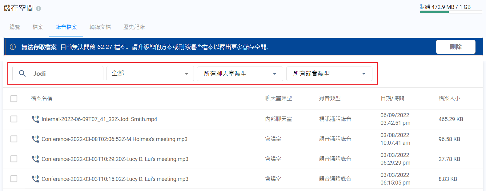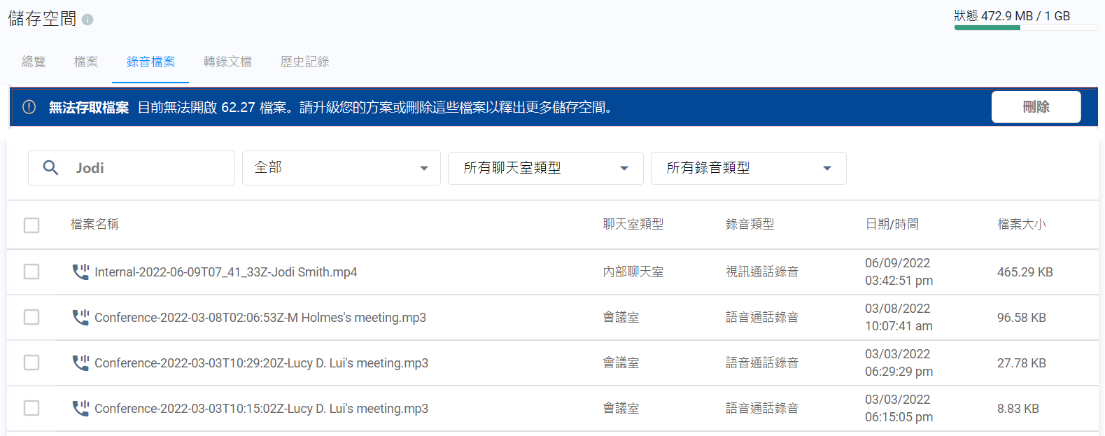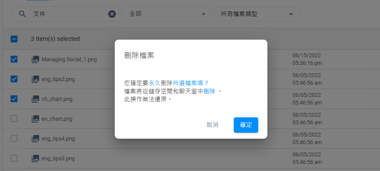 成功刪除後,儲存空間會自動更新,並移除已刪除的文件。 已刪除的錄音檔案將無法在聊天室中預覽或下載。