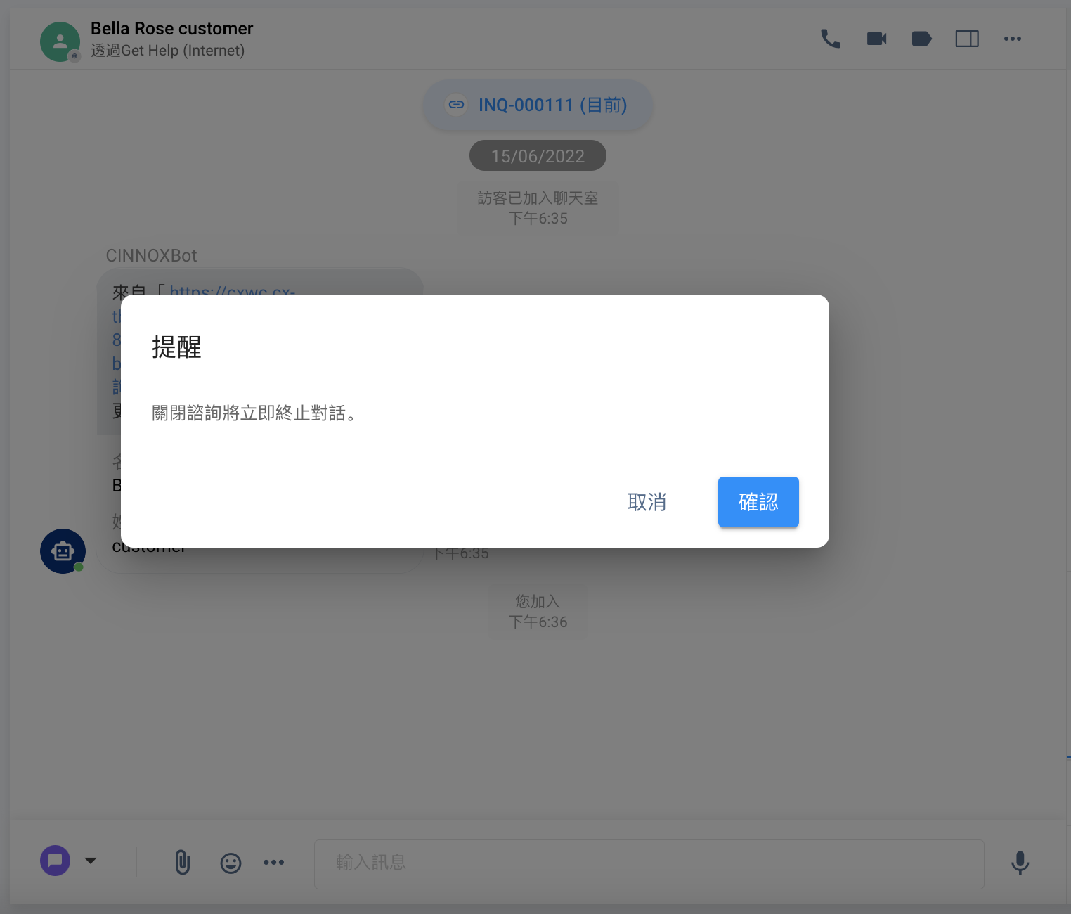 當聊天室在設定日數和時間後,未曾接收新的電郵和新聊天時,系統會自動發出關閉諮詢通知。