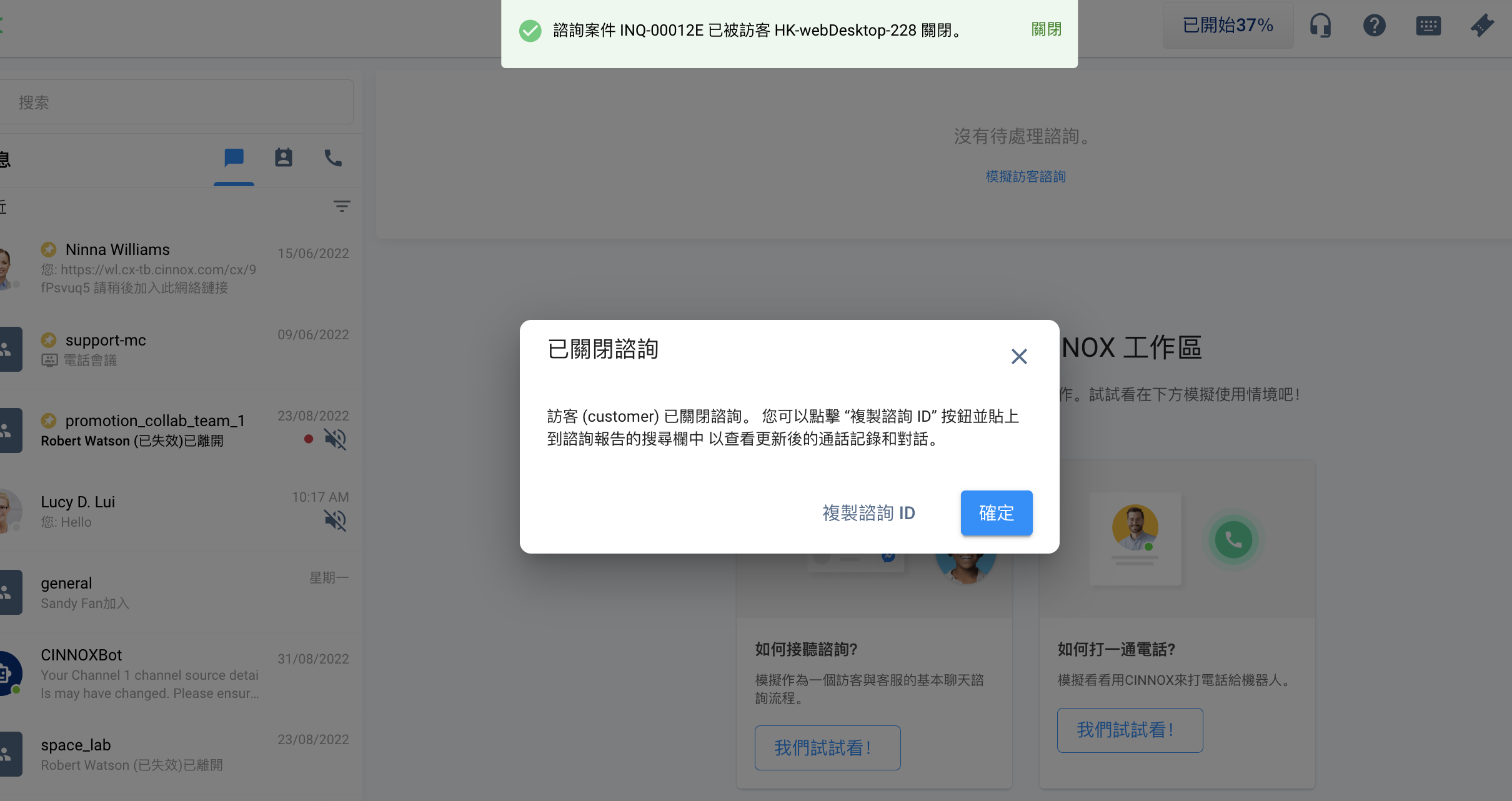 當訪問者結束諮詢時,你的工作區會出現彈出式訊息,通知你諮詢已結束。