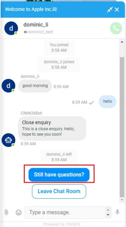 員工或系統關閉諮詢後,Still have questions按鈕會出現在訪客的聊天室。當訪客還有疑問時,他們可以點擊此按鈕,重新與員工的對話,從而回復諮詢過程。此按鈕會安裝在從網頁連結,或懸浮圖標啟動的聊天室。