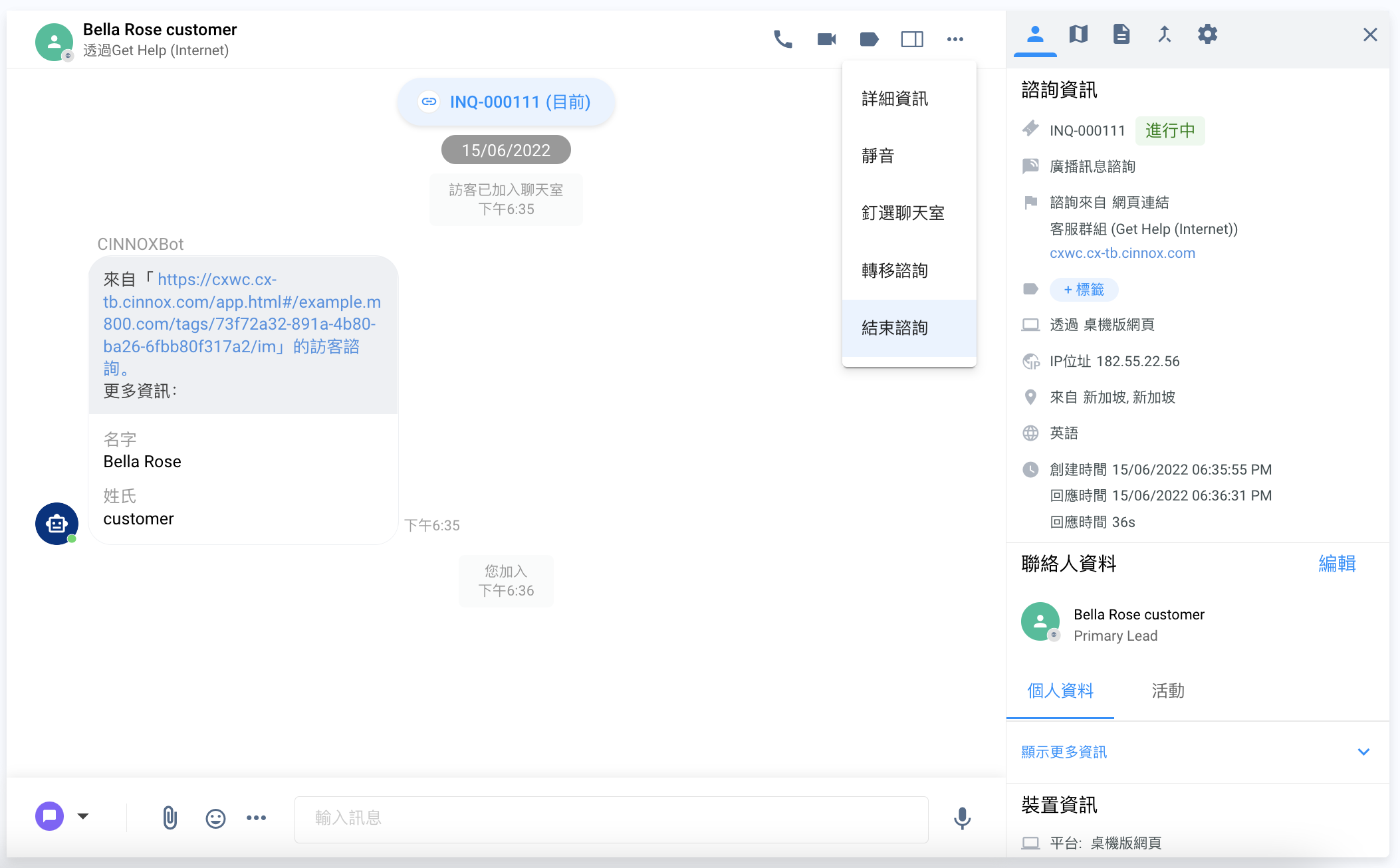 當訪客的問題或疑慮已由客服回答或解決後,便可以結束諮詢。 當諮詢結束時,訪客和客服之間的對話立即終止。
