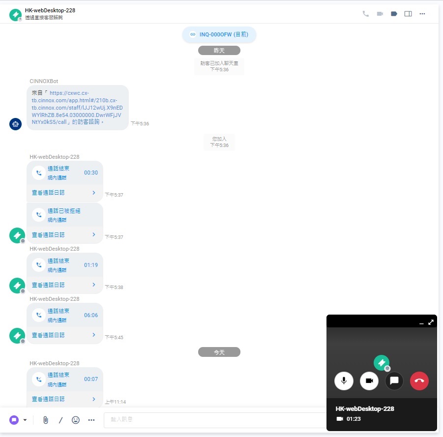 你可以點擊聊天室面板右上角的視頻通話圖標,與客戶、訪客或員工進行視訊通話。