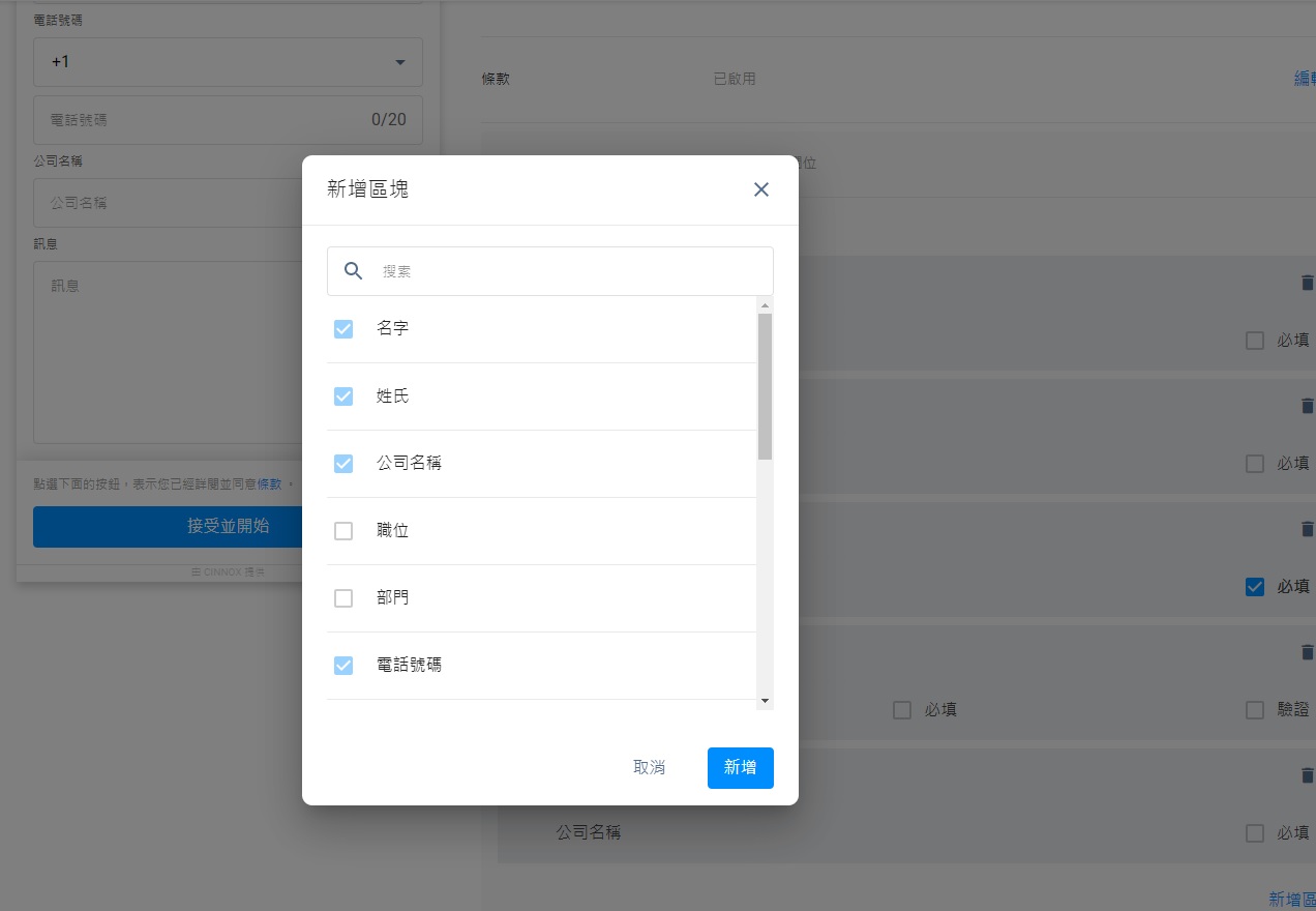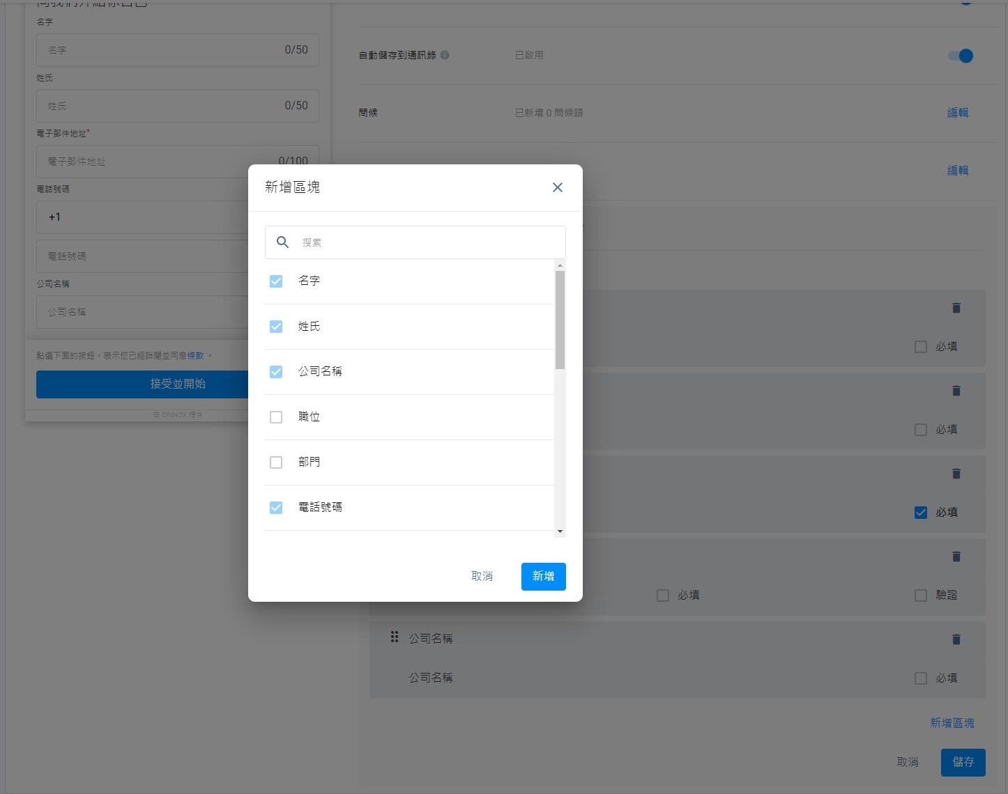 - 點擊新增區塊,彈出式視窗會出現。你可加入如職位、部門和其他從**自訂欄位**新增的欄位到表單中。