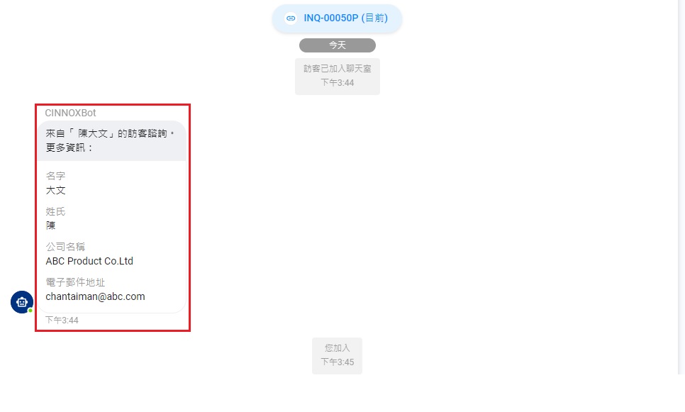訪客在訪客問卷提供的資料,會在員工處理諮詢時的聊天室中顯示。