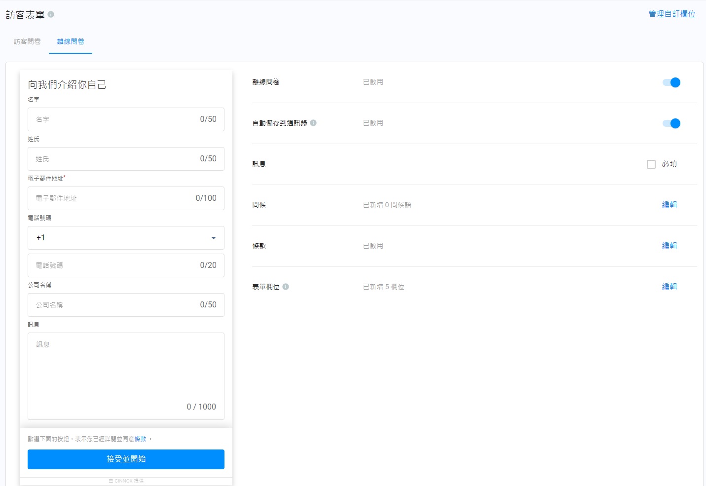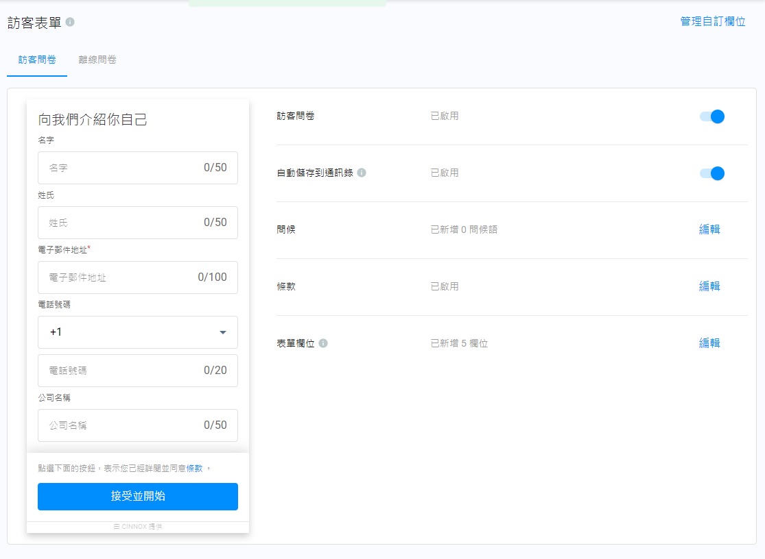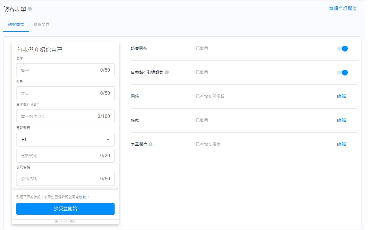 當訪客點擊懸浮圖標(Web widget)、打開網頁連結或掃描標籤的二維條碼時,CINNOX會顯示訪客問卷。此功能預設為停用。