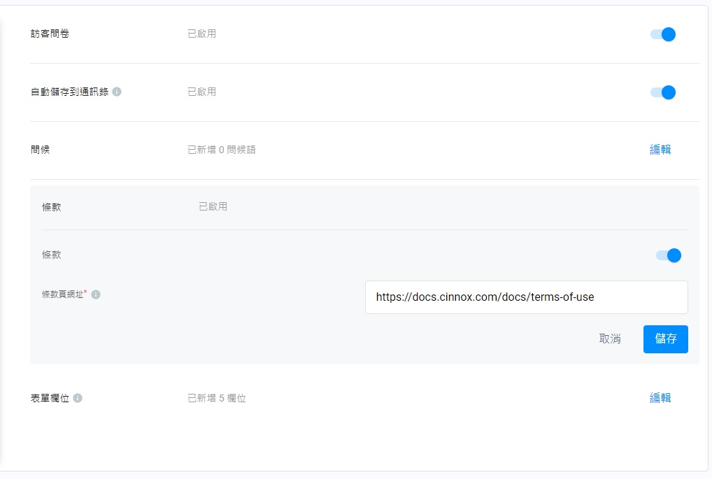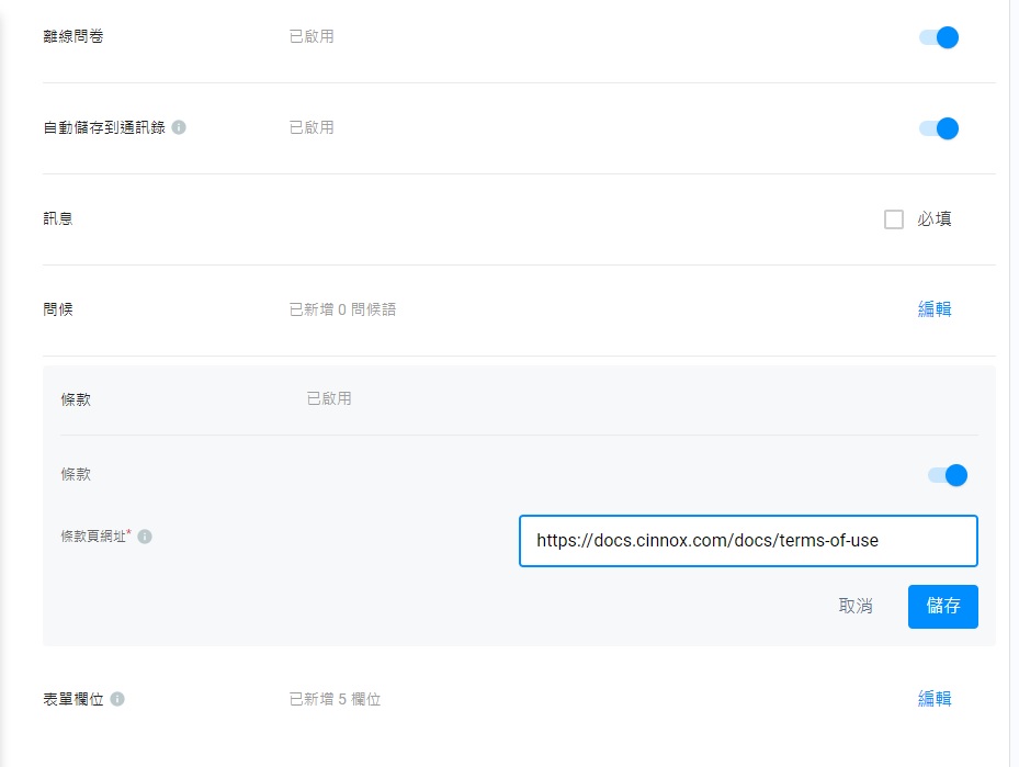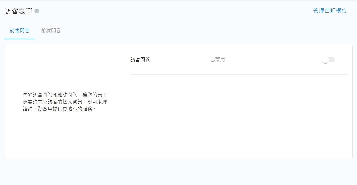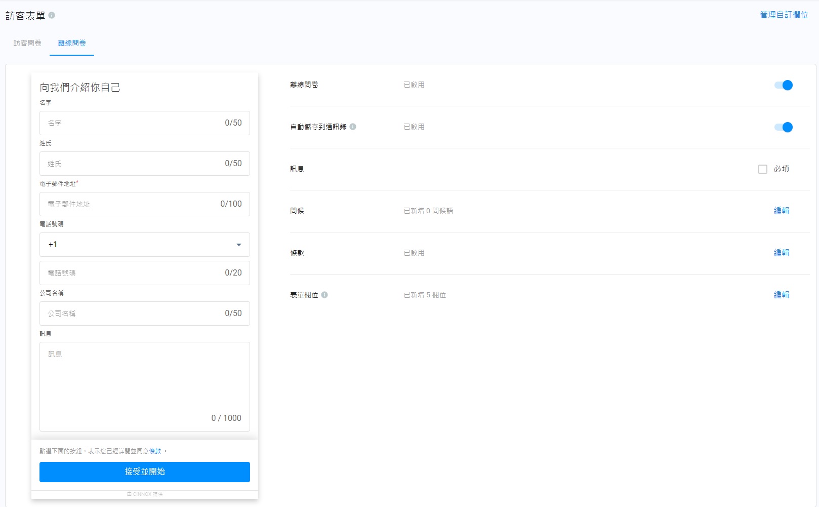 當訪客點擊懸浮圖標(Web widget)、打開網頁連結或掃描標籤的二維條碼時,CINNOX會顯示訪客問卷。此功能預設為停用。