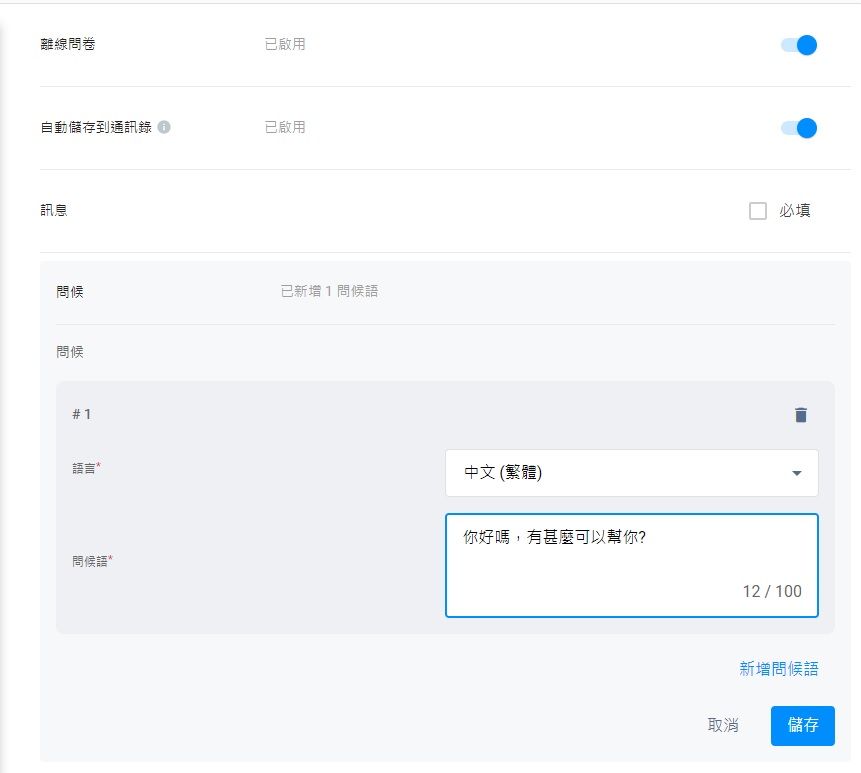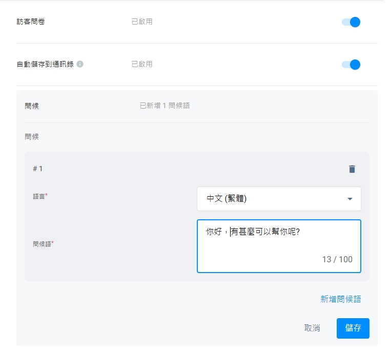 - 重複上述步驟,以加入另一個新問候語,以及其新問候語的語言。