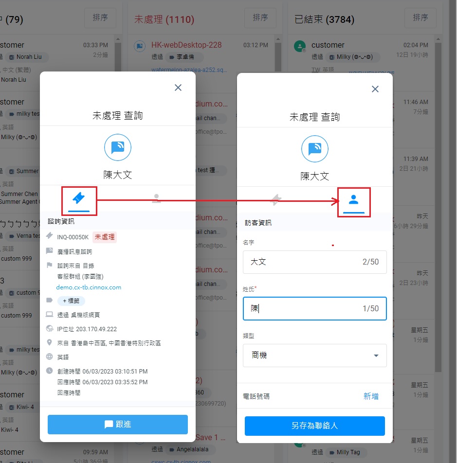 當訪客填寫多份離線問卷時,他們的諮詢會被整合,並與最新的聯絡方法列出在未處理諮詢的欄目內。