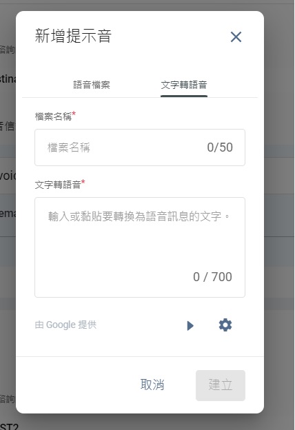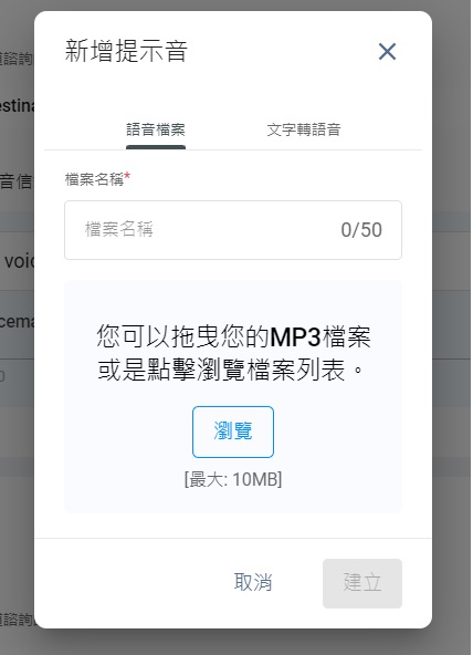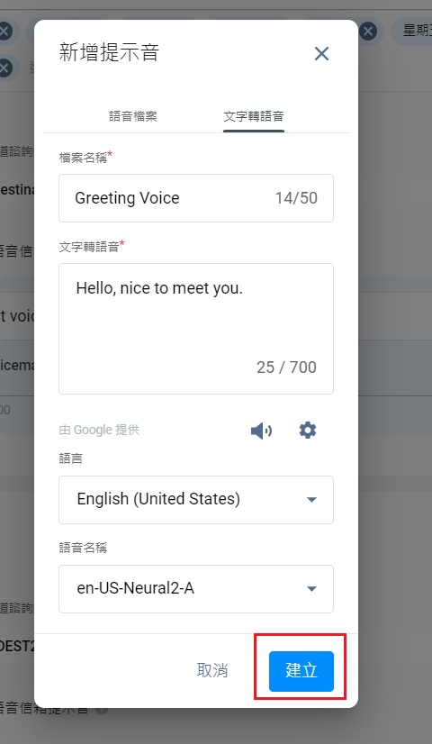 - 點擊建立按鈕,完成上載TTS問候語檔案的步驟。