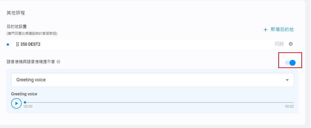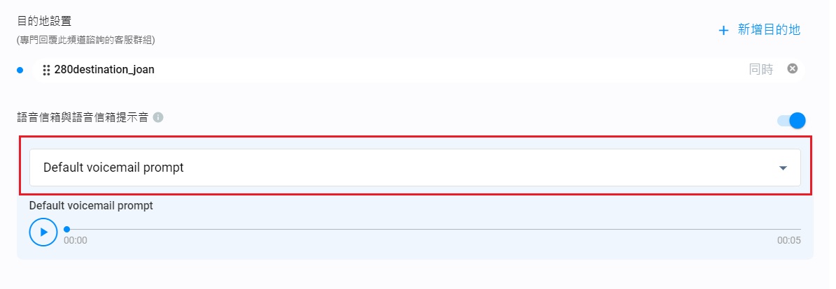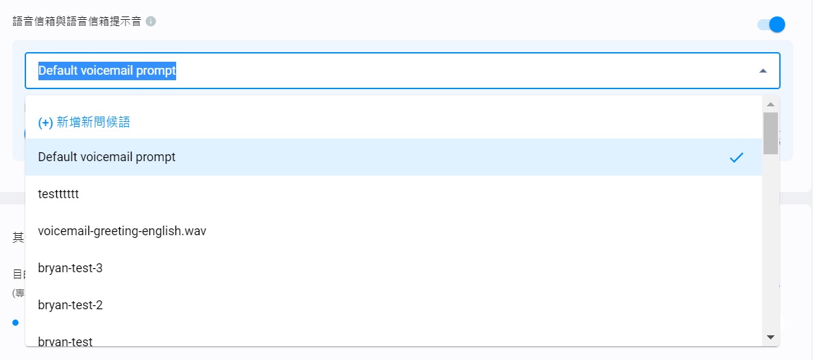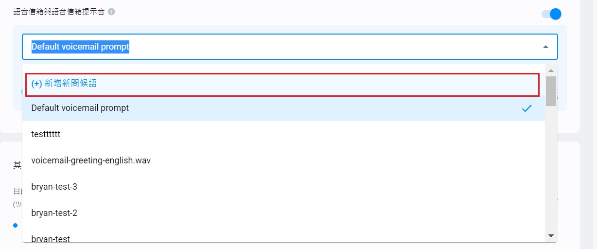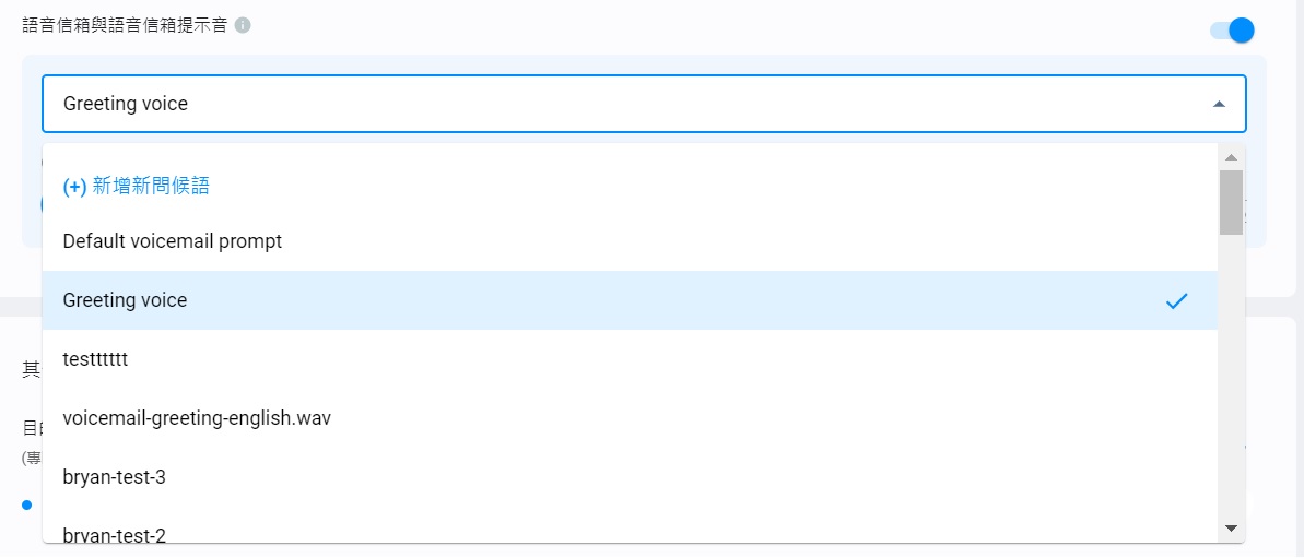 CINNOX 提供預設的簡單語音信箱問候語。你可以從下拉式清單中選擇想使用的問候語。這是訪客在留言前會聽到的錄音。