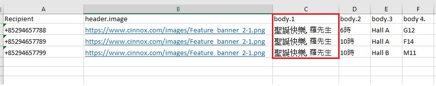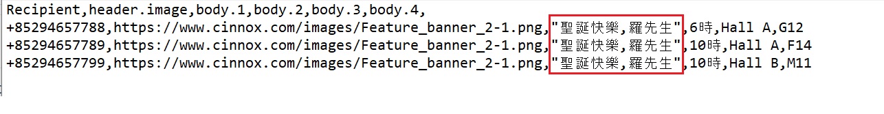- body.1 欄裡的聖誕快樂, 羅先生含有逗號。於是,檔案上載後,文字分隔成兩行,聖誕快樂在body.1欄,而羅先生則在body.2欄。