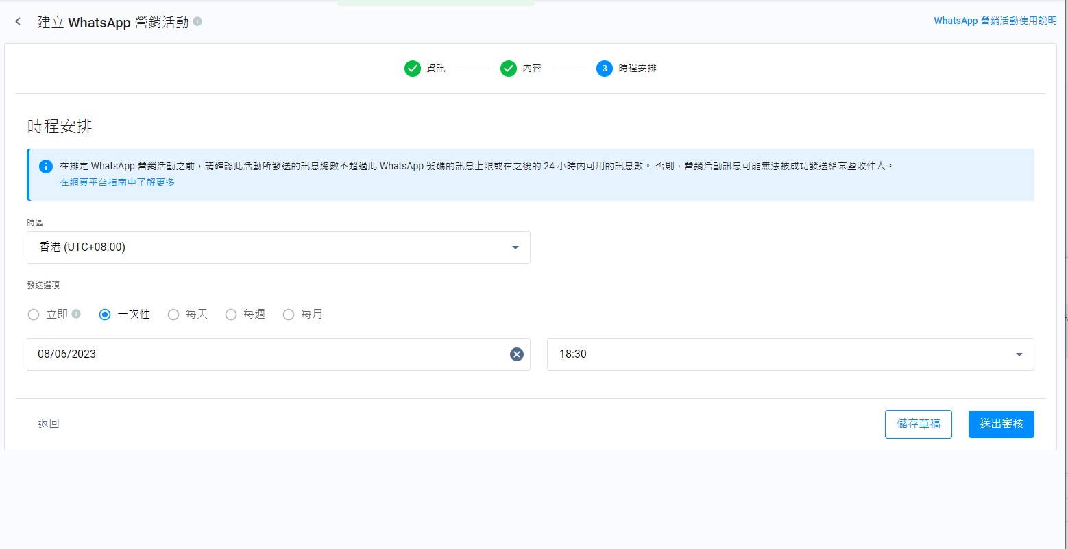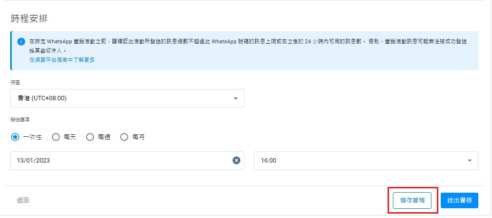 - 你可以點擊儲存草稿儲存營銷活動草稿。此草稿會移到營銷活動草稿的版面上。