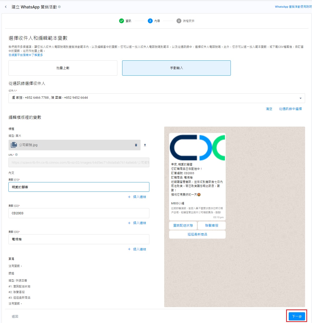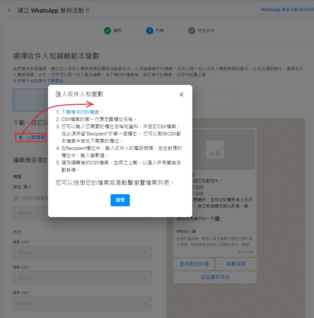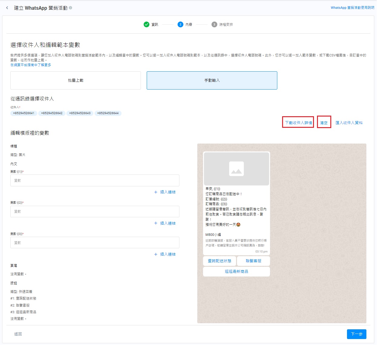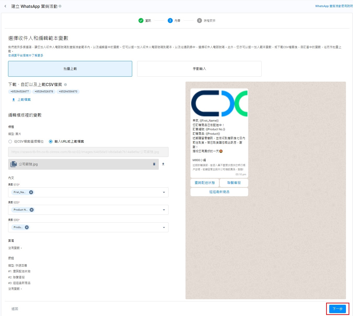 當CSV檔案上載成功後,收件人的電話號碼和變數會顯示在螢幕上。