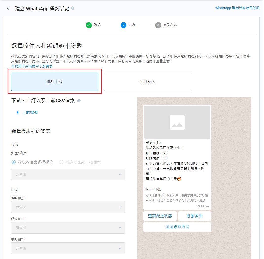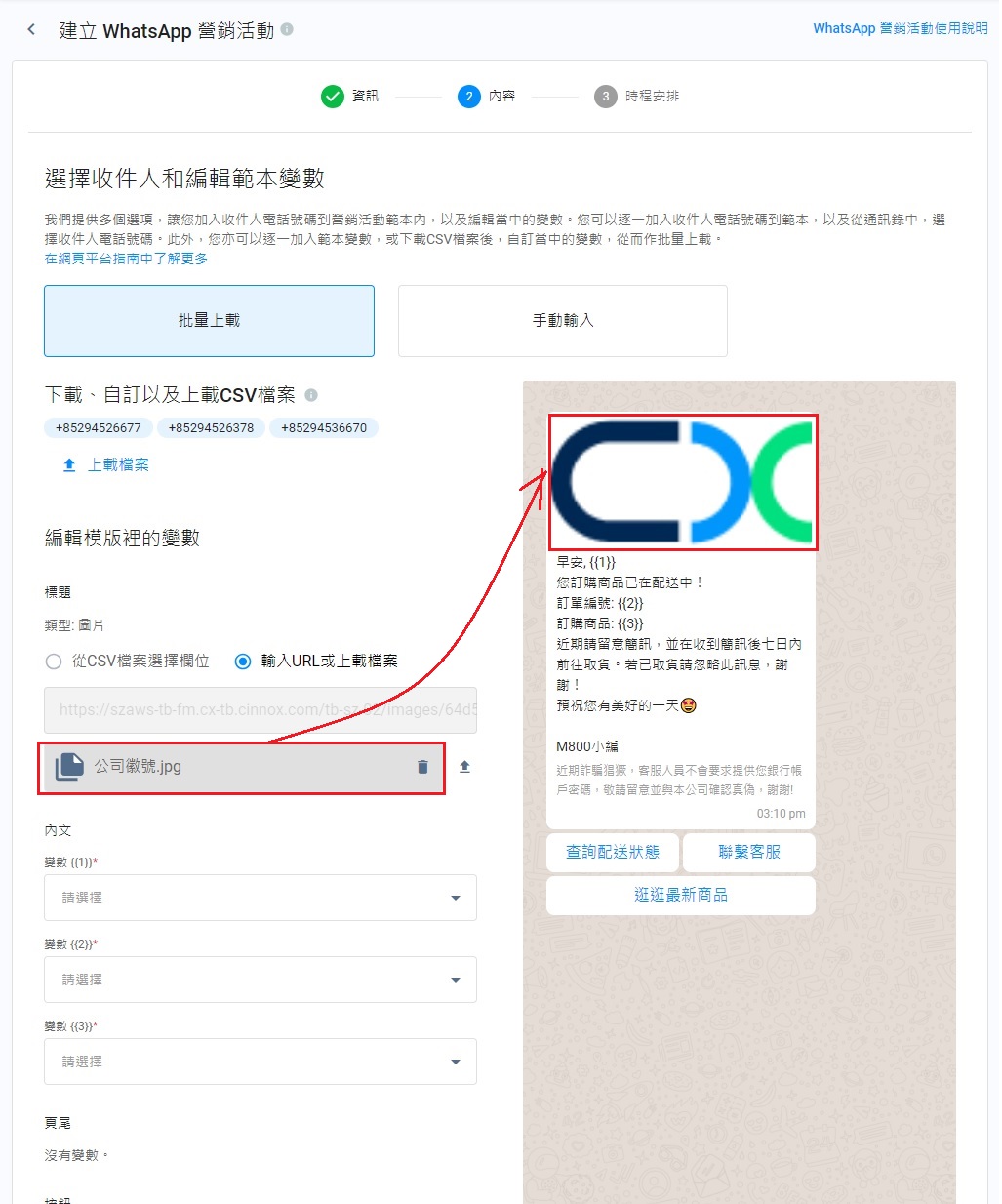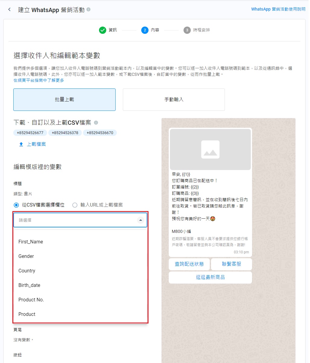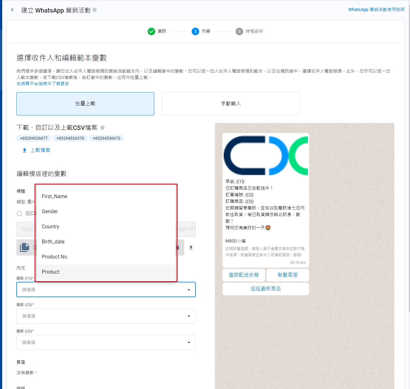 你可以直接從CSV檔案,選擇合適資料的欄位,作為不同WhatsApp模板中的變數,從而節省每次手動輸入變數的時間。因此,客服只需要管理數目較少的CSV檔案。