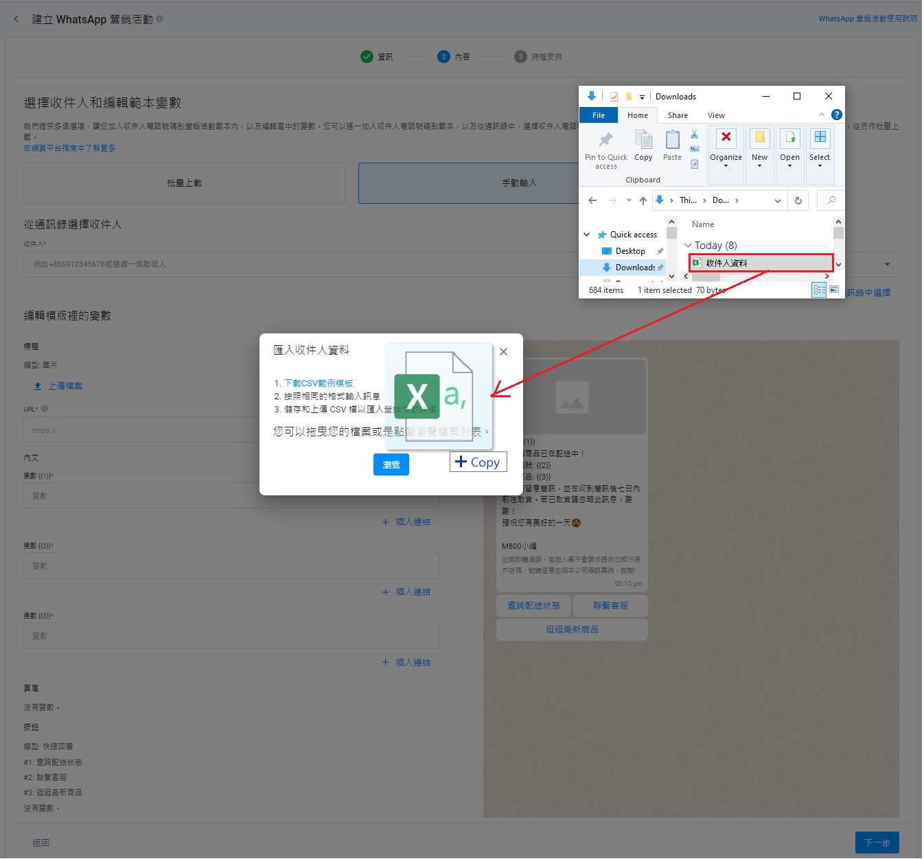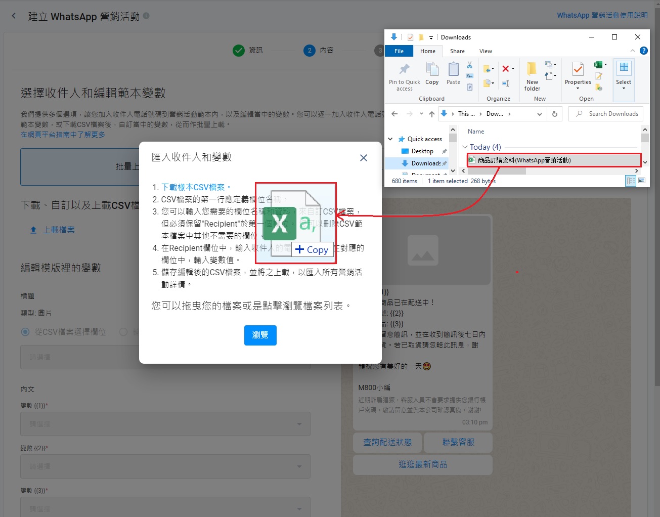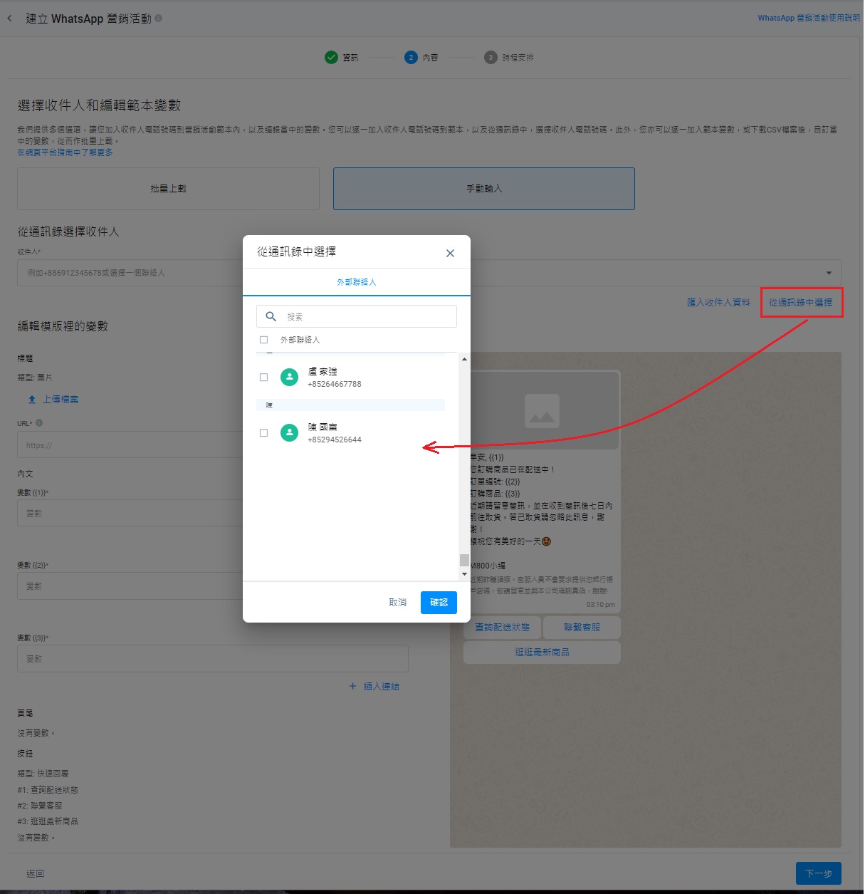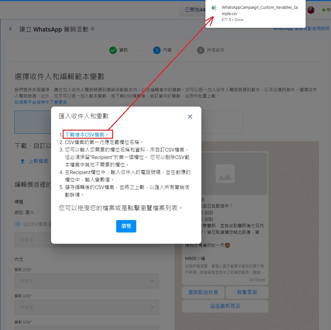 你可以直接從CSV檔案,選擇合適資料的欄位,作為不同WhatsApp模板中的變數,從而節省每次手動輸入變數的時間。因此,客服只需要管理數目較少的CSV檔案。