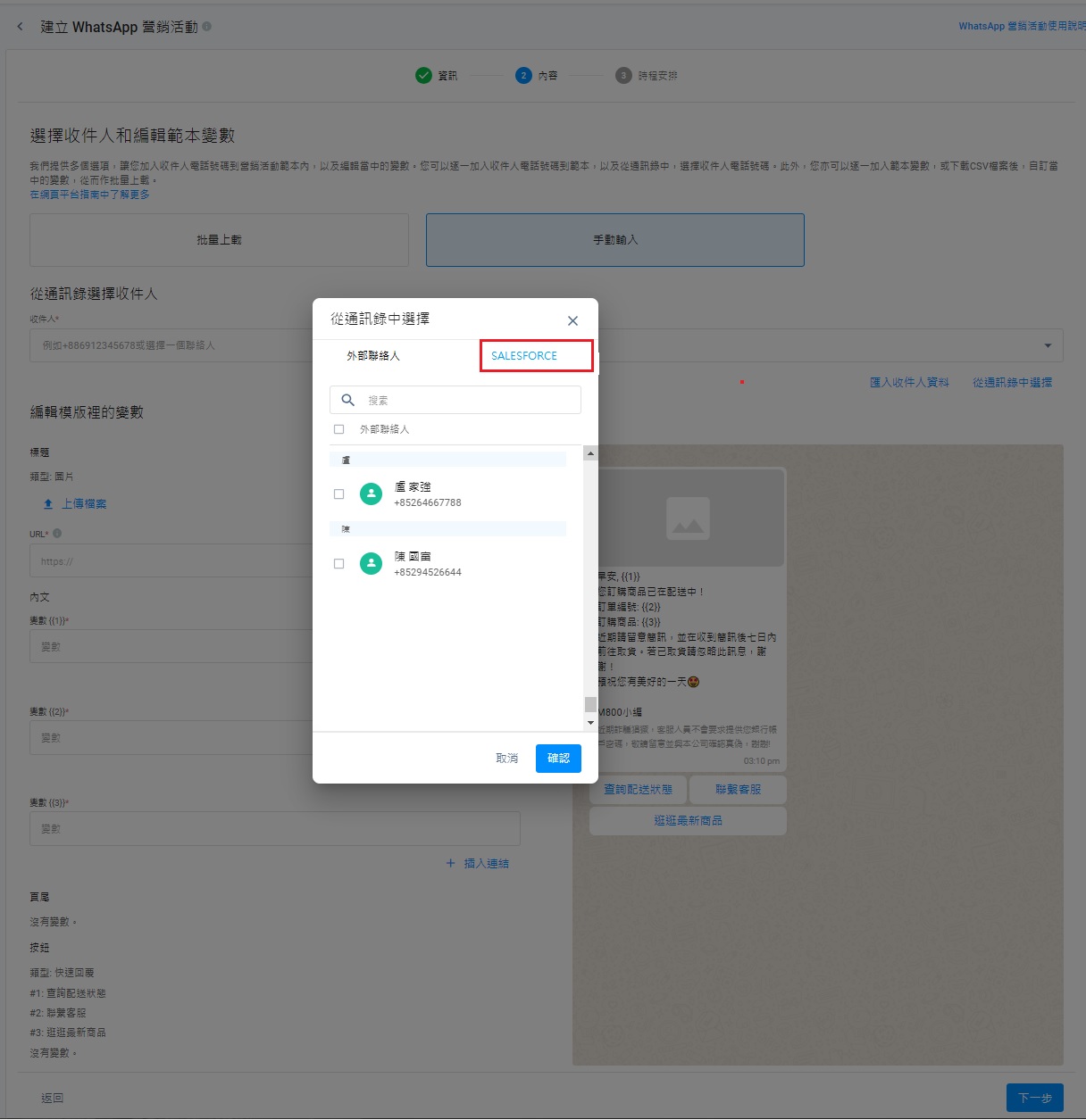 如果你的Salesforce通訊錄已經和CINNOX同步,你可以從該通訊錄中,選擇WhatsApp營銷活動的收件人。