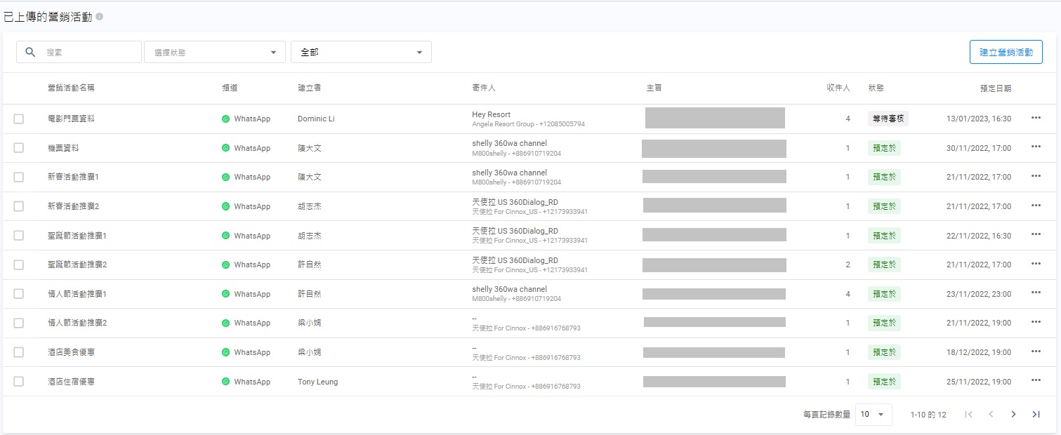 - 完成了建立簡訊動態營銷活動後,該營銷活動會在已上傳的營銷活動版面上列出。
