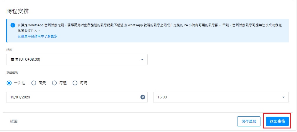 - 設定營銷活動發送時間。預設日期為設定時程安排的最近三十分鐘。例如:你設定時程安排的時間為4時10分,預定設定時間為5時正。