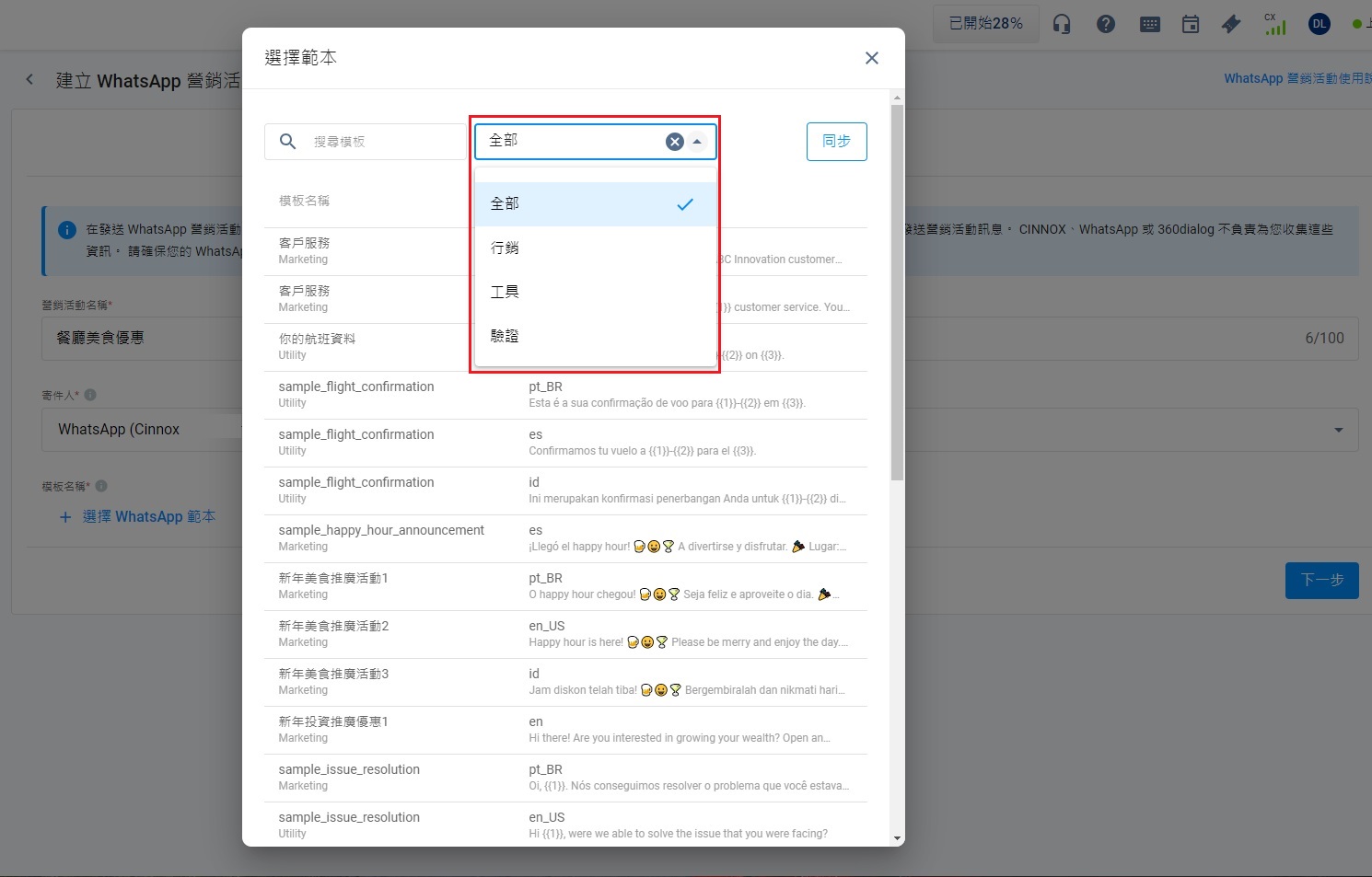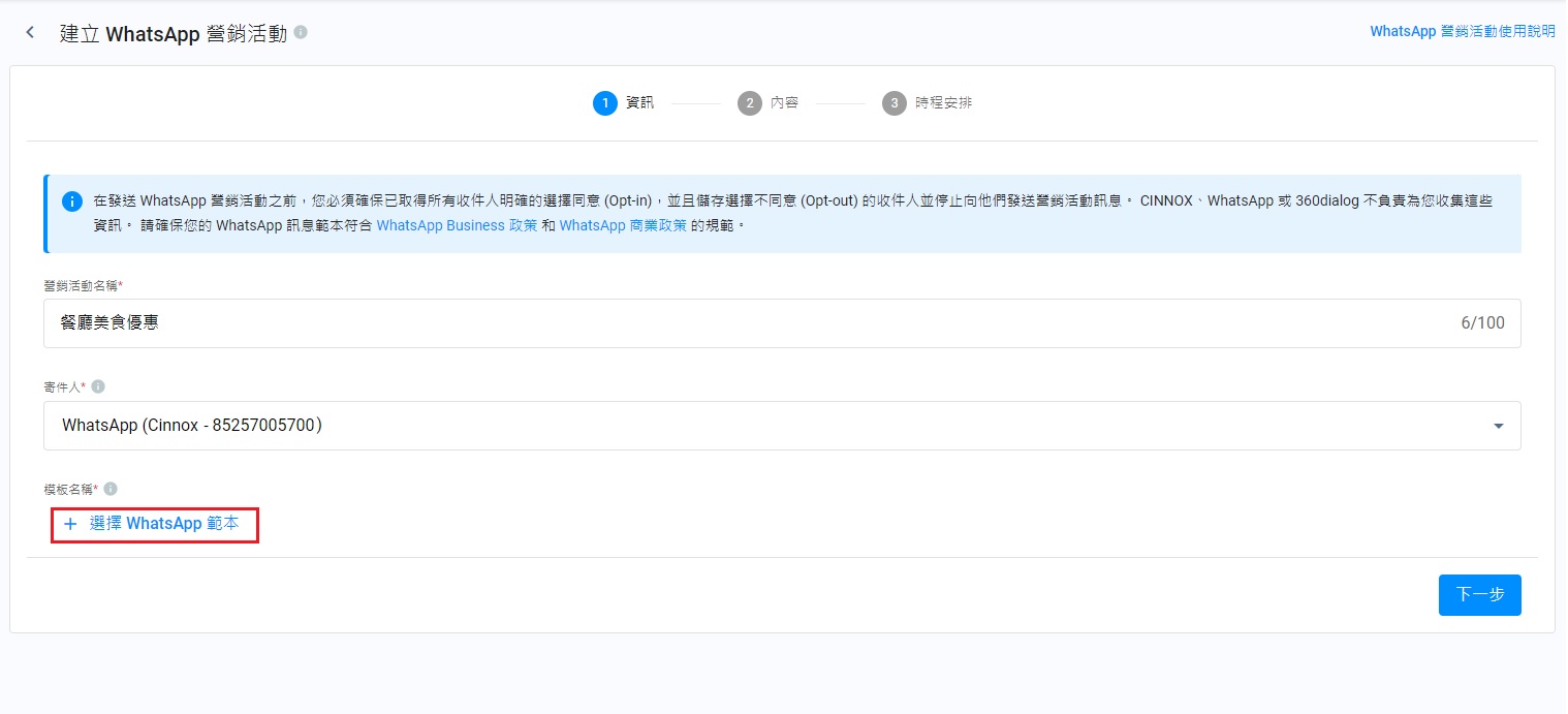 - 點擊**+選擇WhatsApp範本**,以選擇WhatsApp 範本。關於其已知限制,可參考WhatsApp營銷活動模板的已知限制部份。