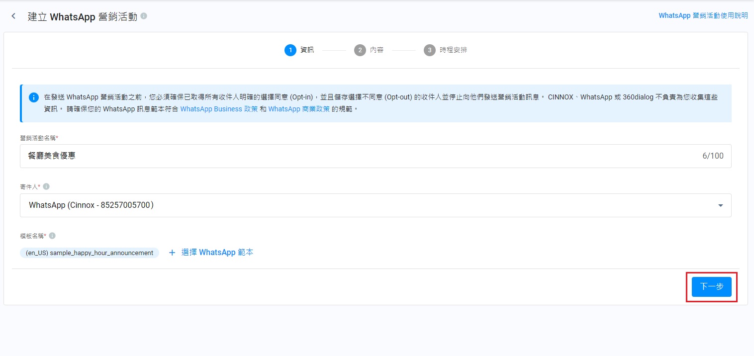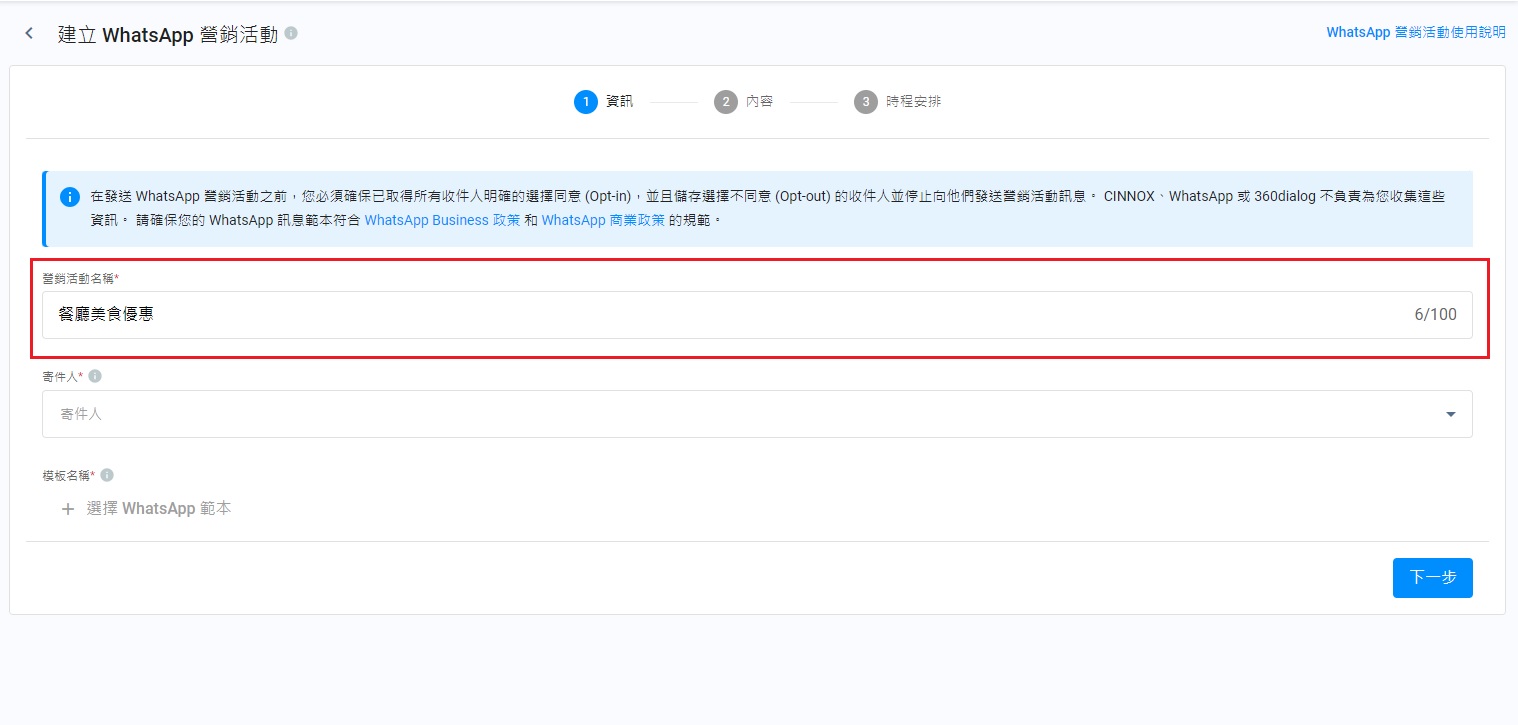 在建立WhatsApp營銷活動前,請確保360dialog已經成為WhatsApp 來源,並且已經連結到CINNOX的WhatsApp頻道。