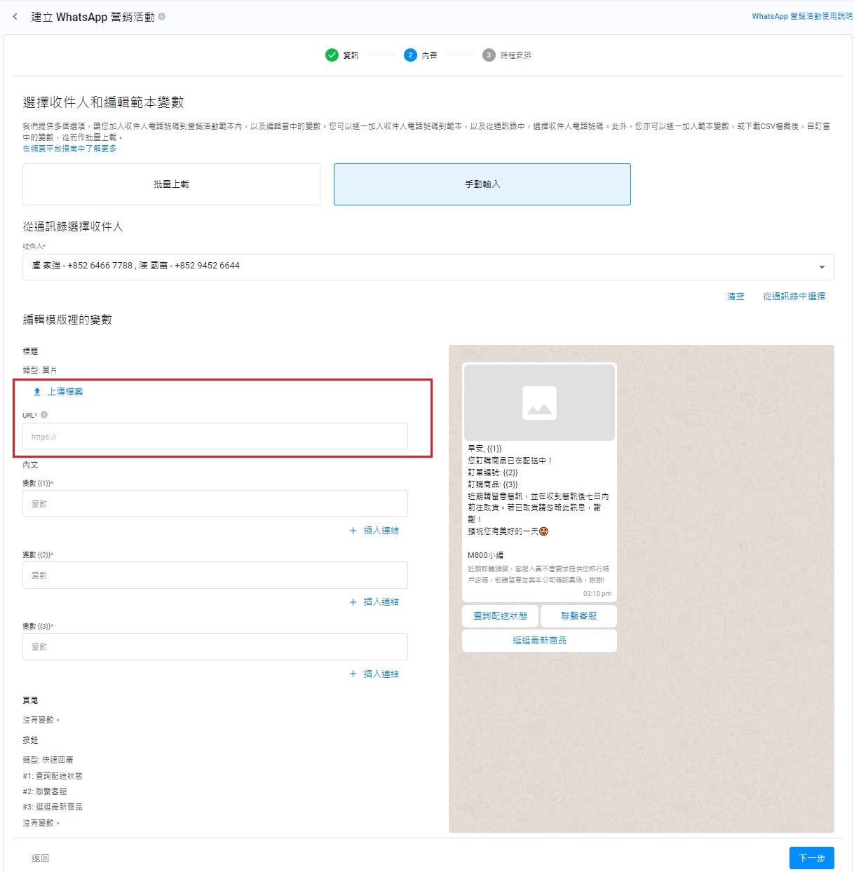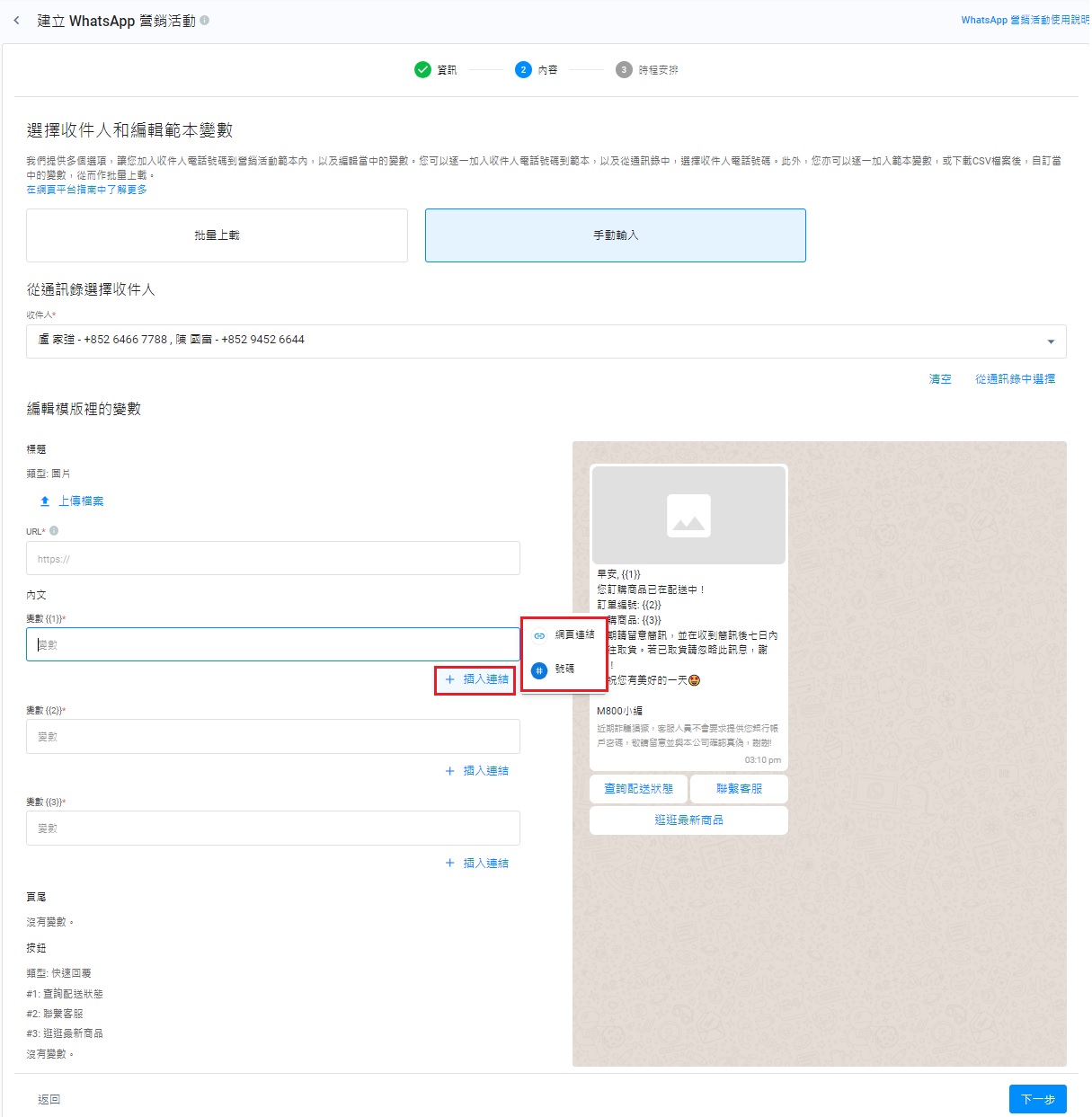 - 在編輯模版裡的變數下,填上範本內的標題、內文、頁尾和按鈕內的所有變數。你亦可選擇點撃插入連結,在變數欄目加入網頁連結或號碼。