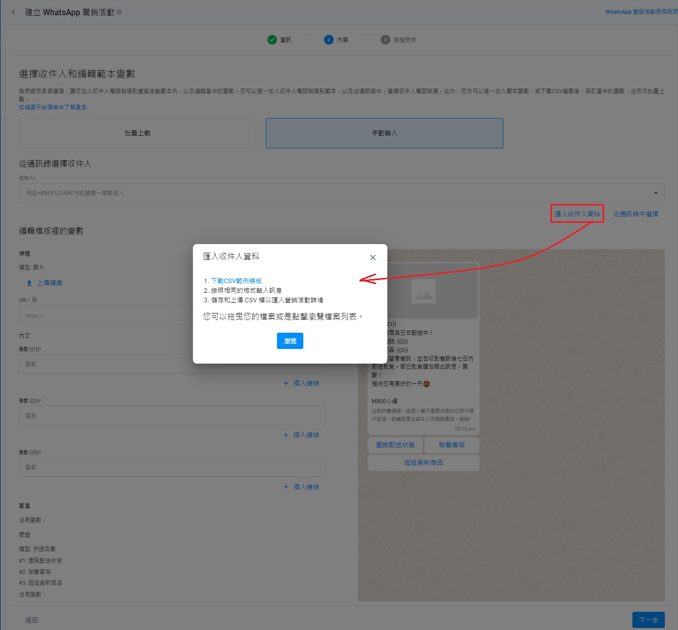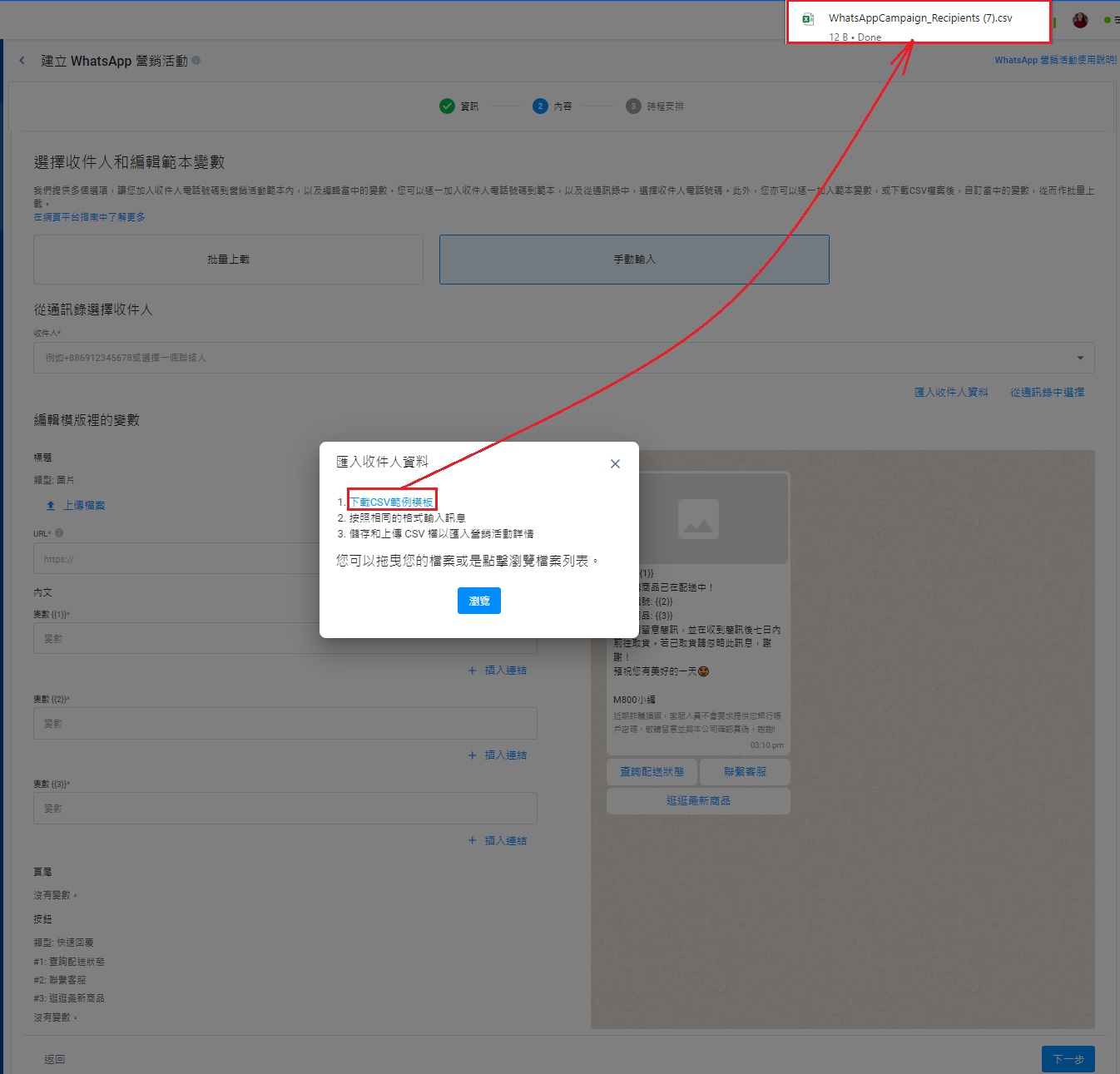 - 在匯入收件人資料的彈出式視窗,點擊下載CSV範例模板,以下載試算表模板。