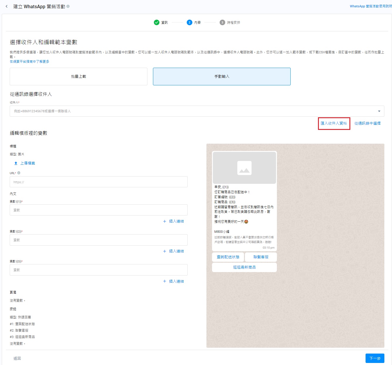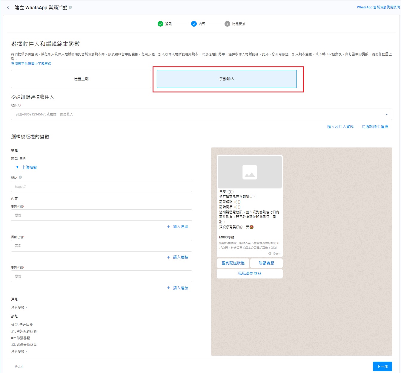 在選擇收件人和編輯範本變數頁,點擊手動輸入。