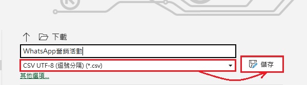 以CSV URF-8 (逗號分隔) (*.csv) 格式儲存檔案。