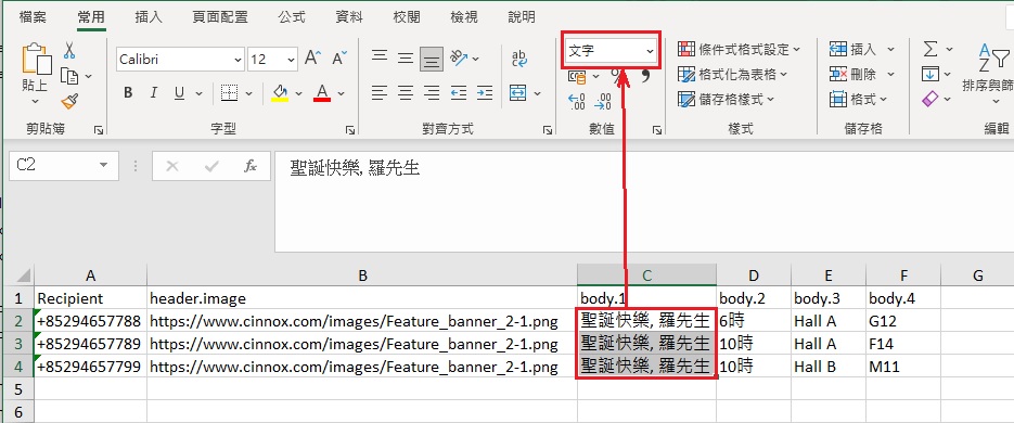 - 在含有逗號的文字加上開雙引號(“”),例如:“聖誕快樂, 羅先生” ,並將其儲存為CSV檔案上載。