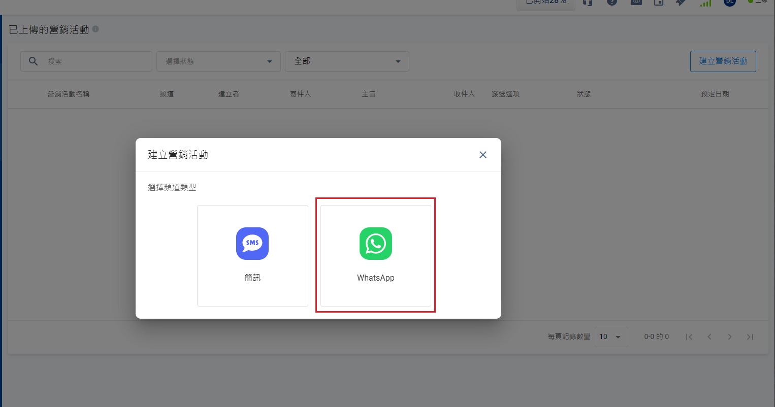 - 點擊頁面右上角的建立營銷活動。選擇WhatsApp作為頻道類型。