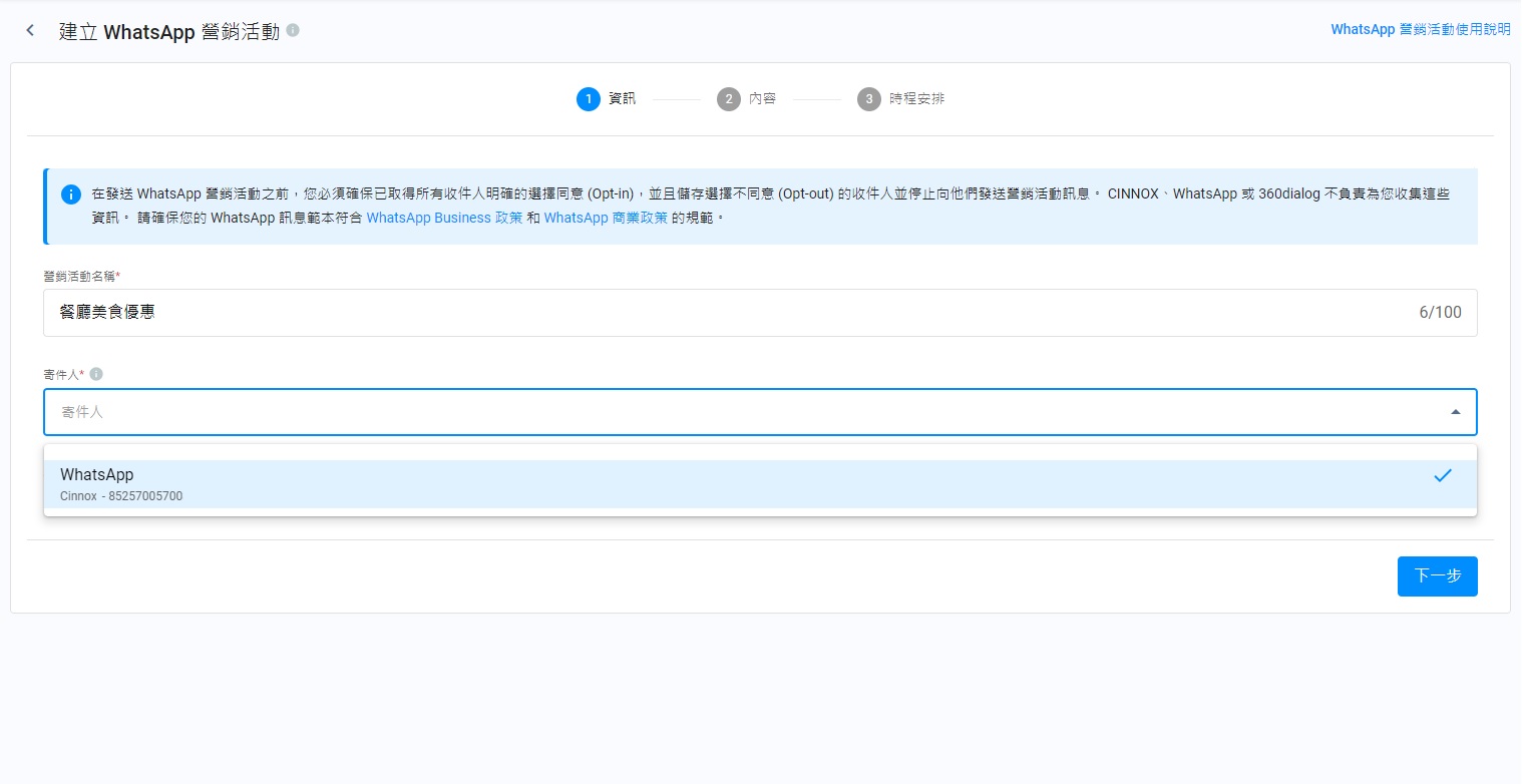 - 點擊寄件人的下拉式清單,選擇你用來發送WhatsApp 營銷活動的WhatsApp 頻道 (WABA number),作為寄件人。