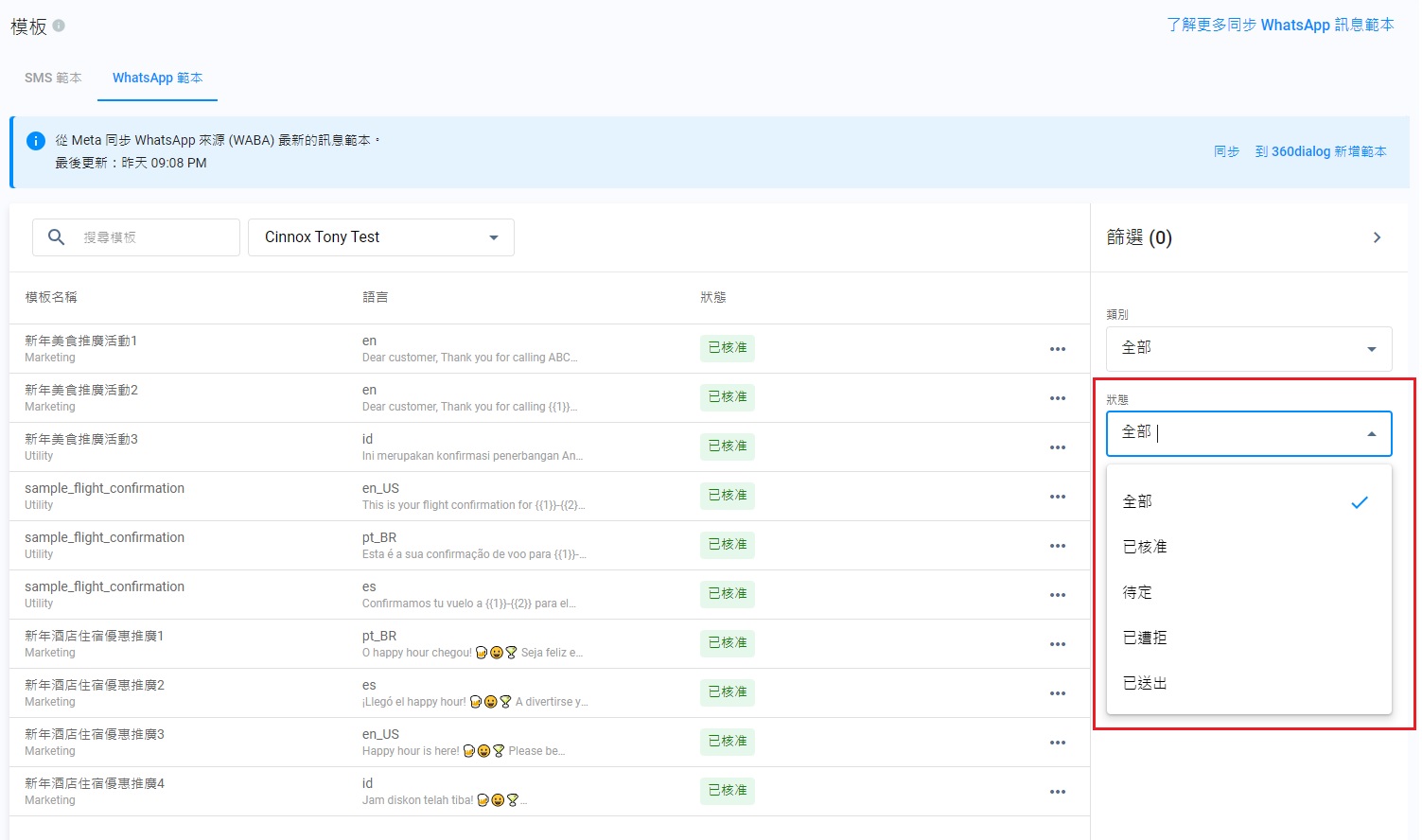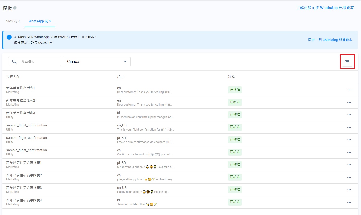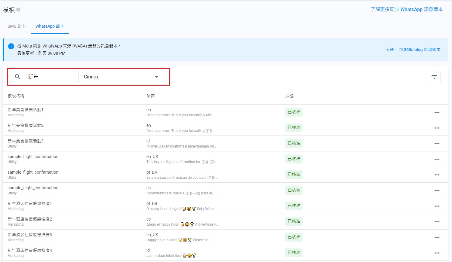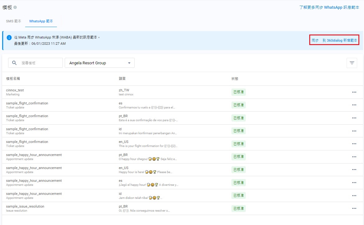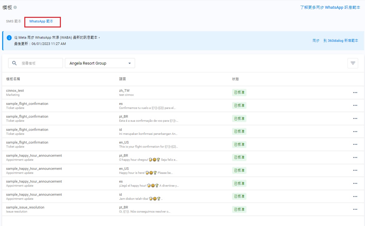 - 同時在CINNOX和360dialog上編輯WhatsApp模板,可能會導致版本不一致的情況。客服有可能看到已發送的是新版本模板,而訪客則接收到其舊版本。