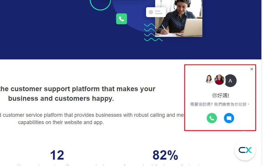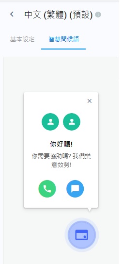 智慧問候語是當你的訪客,在任何時候使用懸浮圖標時,懸浮圖標第一時間自動顯示的歡迎字句。這歡迎字句從縮少的懸浮圖標彈出,用於提醒你的訪客,他們可以使用懸浮圖標,與客服通話或聊天。這是富創意和簡單的方法,給予訪客最佳的第一印象。