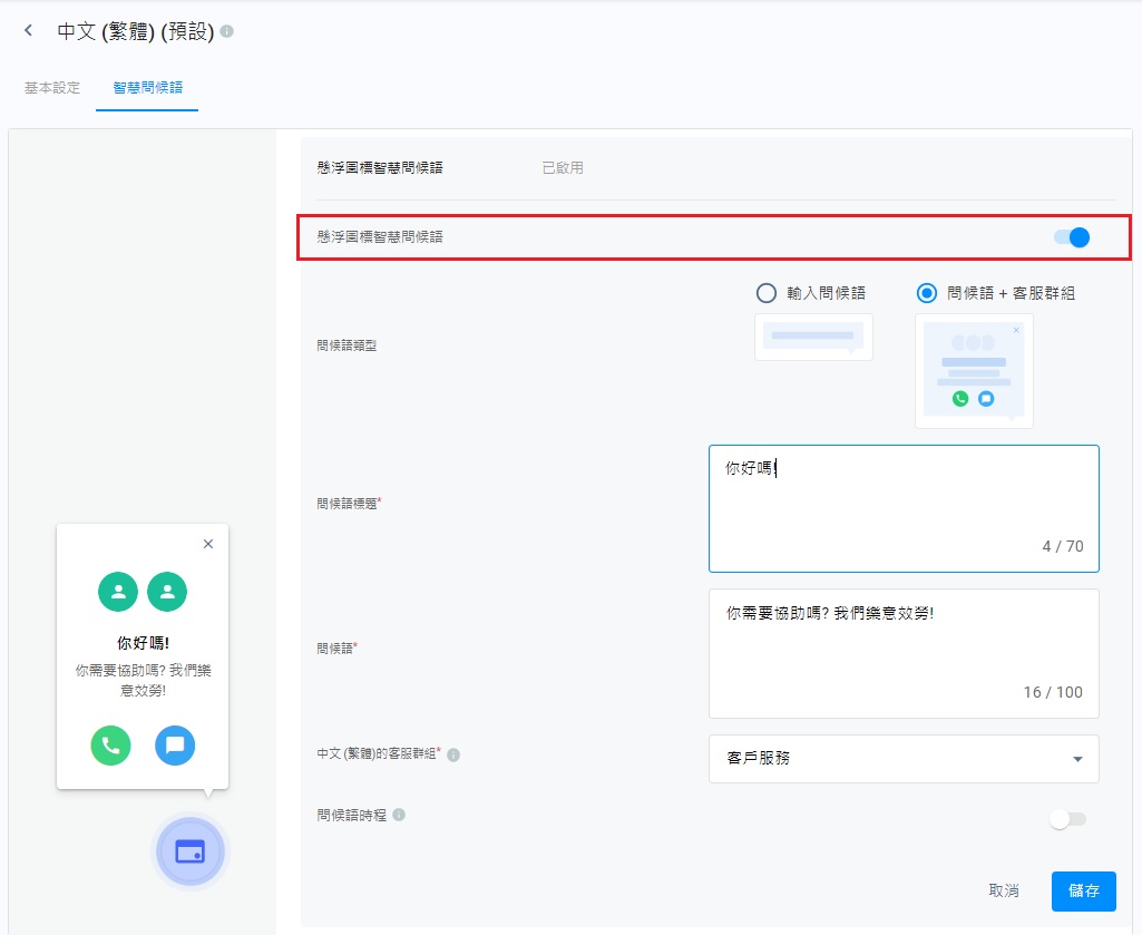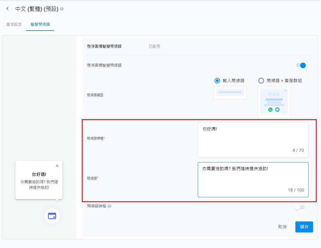 啟用後,你可以自訂外觀、內容,以及設定智慧問候語。