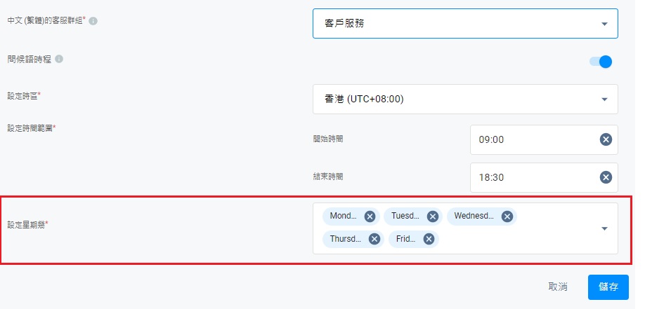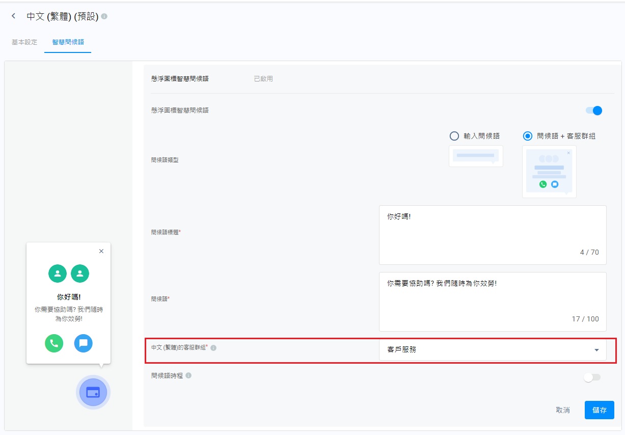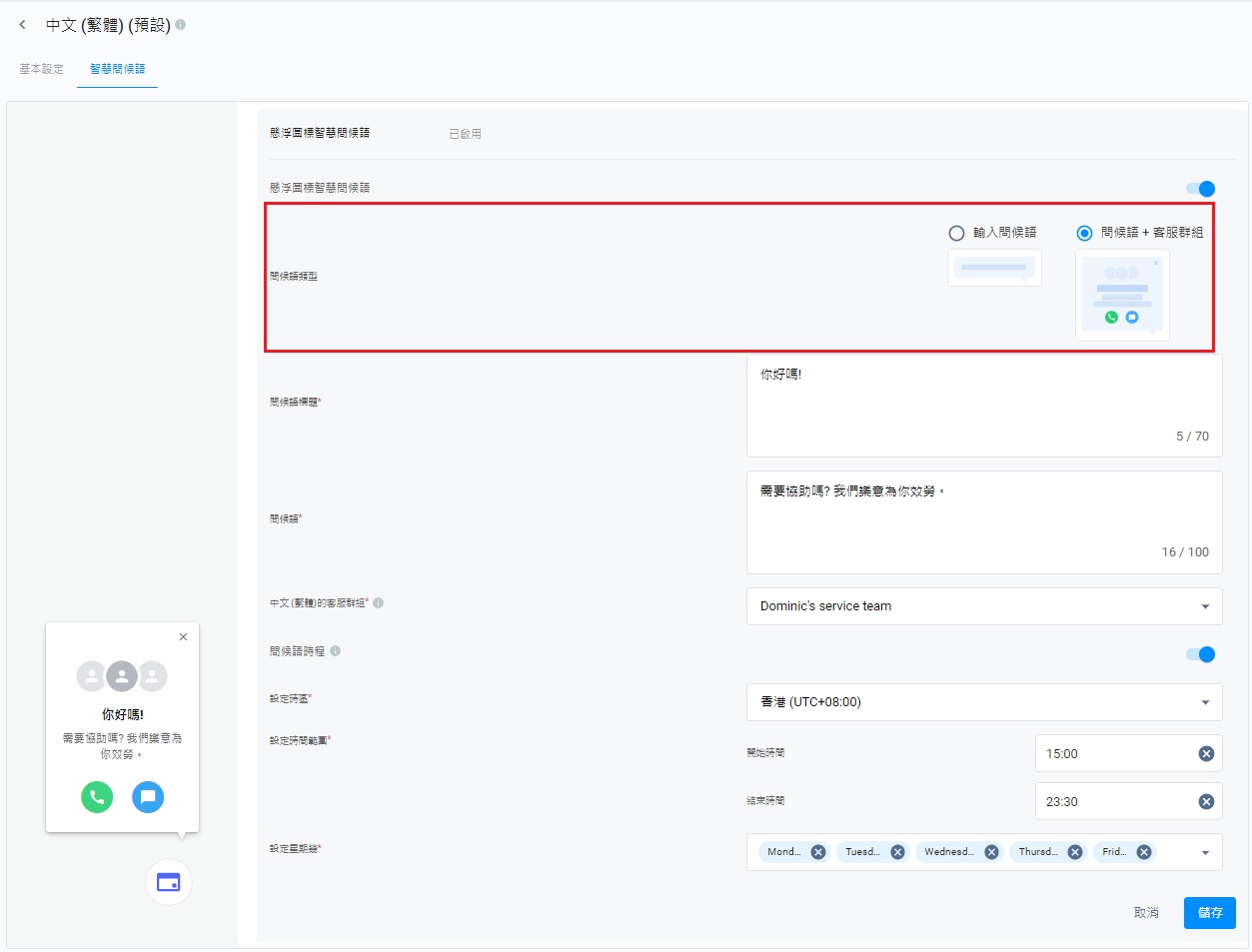 如果你選擇的問候語類型是問候語+客服群組,便需要選擇一個客服群組,CINNOX會將來自智能問候語傳入的諮詢,傳送到你選擇的客服群組。