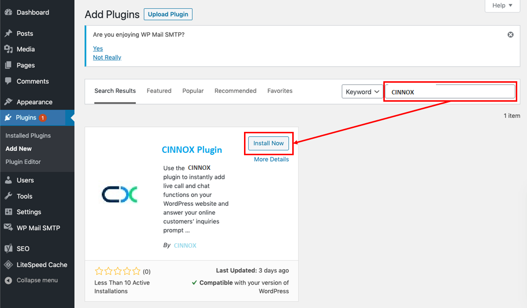 - 在Plugins目錄中,螢幕右側的搜索欄中輸入CINNOX。找到CINNOX Plugin後,然後點擊Install Now。等待幾分鐘,直到WordPress完成安裝外掛程式為止。