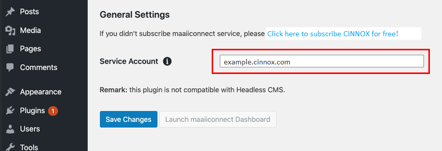 - 在將出現的CINNOX plugin Settings窗格中,輸入你CINNOX服務的URL。如果你尚未註冊 CINNOX 服務,請點擊連結,進入CINNOX網站註冊帳號。