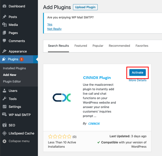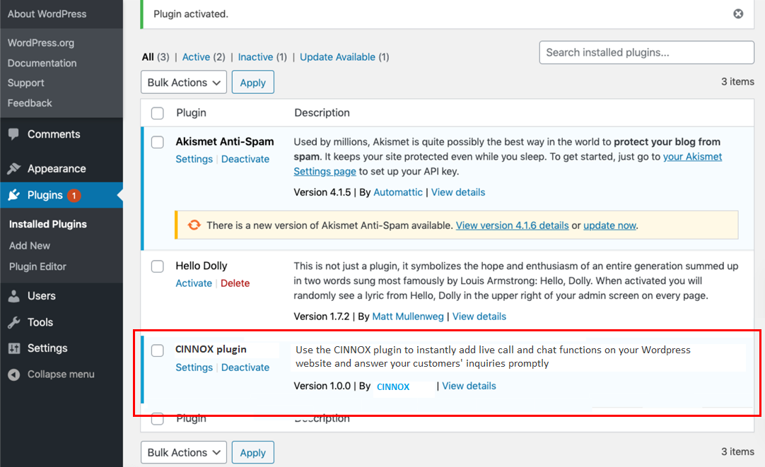 - 點擊Activate。 這會將你轉到WordPress Dashboard 的Plugins部份,其中,CINNOX已在WordPress Plugins的名單中。