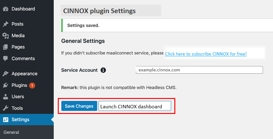 - 點擊Save Changes。你也可以點擊 Launch CINNOX Dashboard,從而在瀏覽器前往CINNOX控制面板。